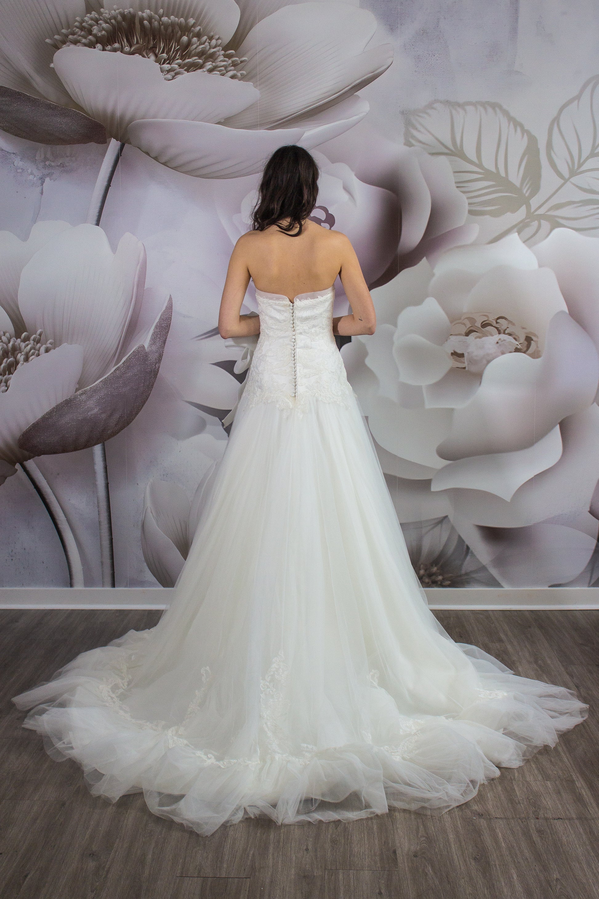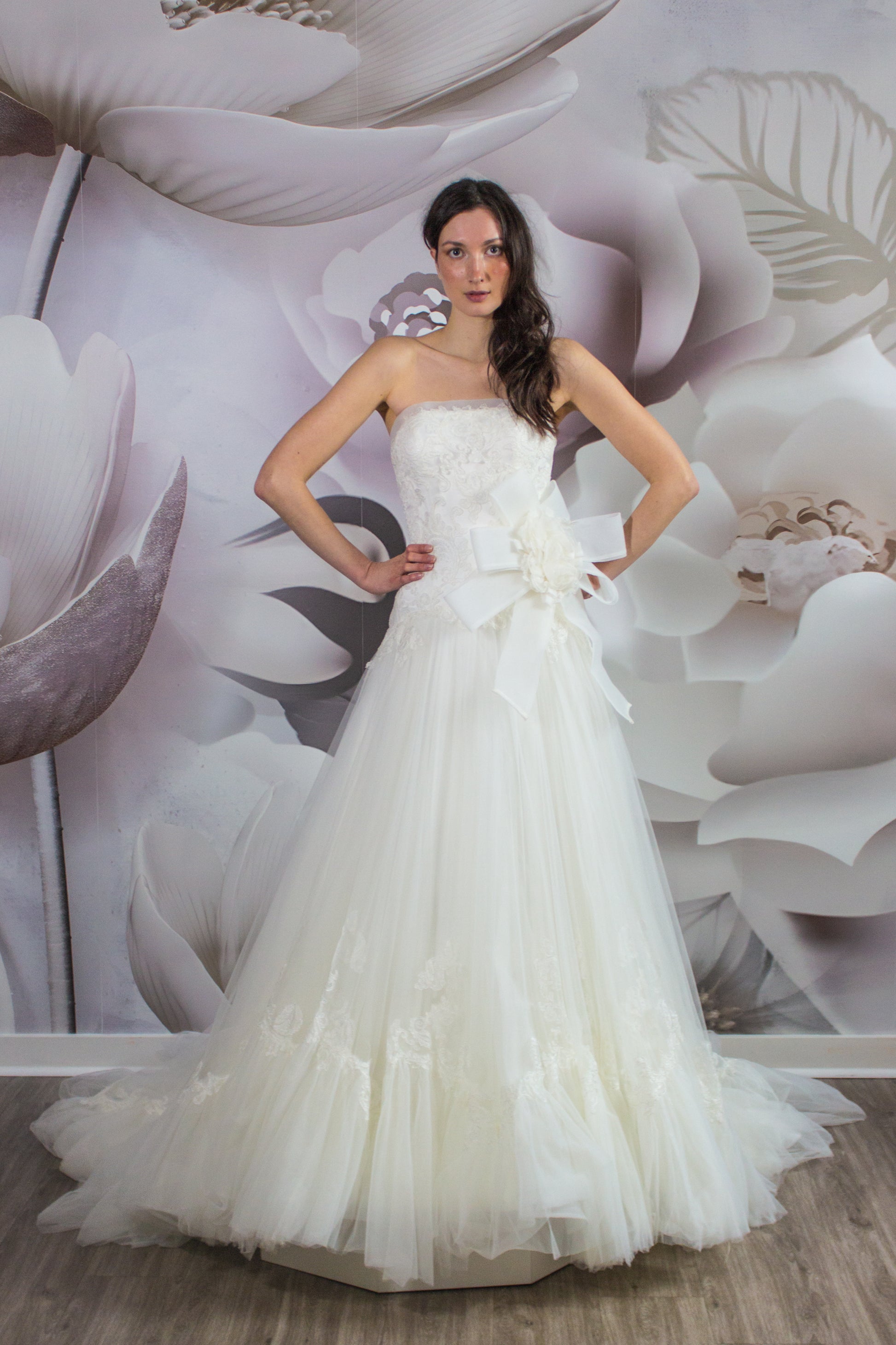 Featuring an A-line silhouette, the gown drapes gracefully, while the layered tulle skirt adds volume and whimsy to your bridal look. The fitted bodice, embellished with delicate lace, enhances your silhouette with a touch of glamour.