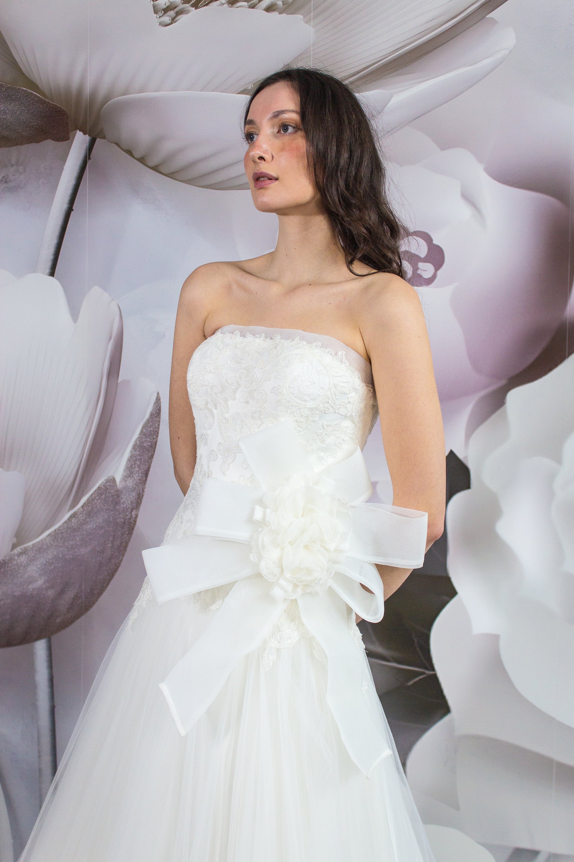 The gown showcases a stunning strapless design, accentuating your femininity and grace. Adorned with intricate lace appliques and a large decorative bow, it exudes a sense of timeless elegance and charm.