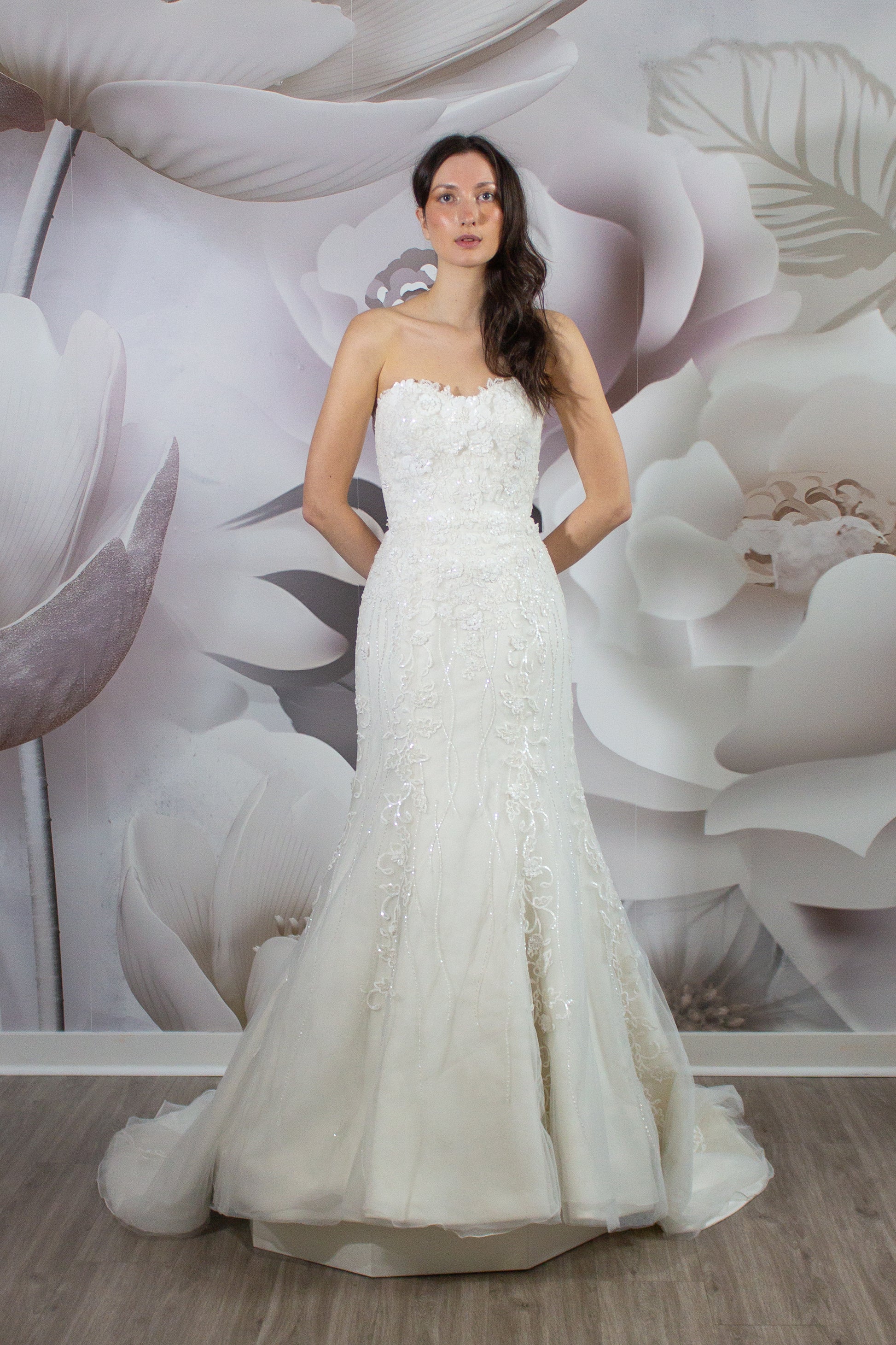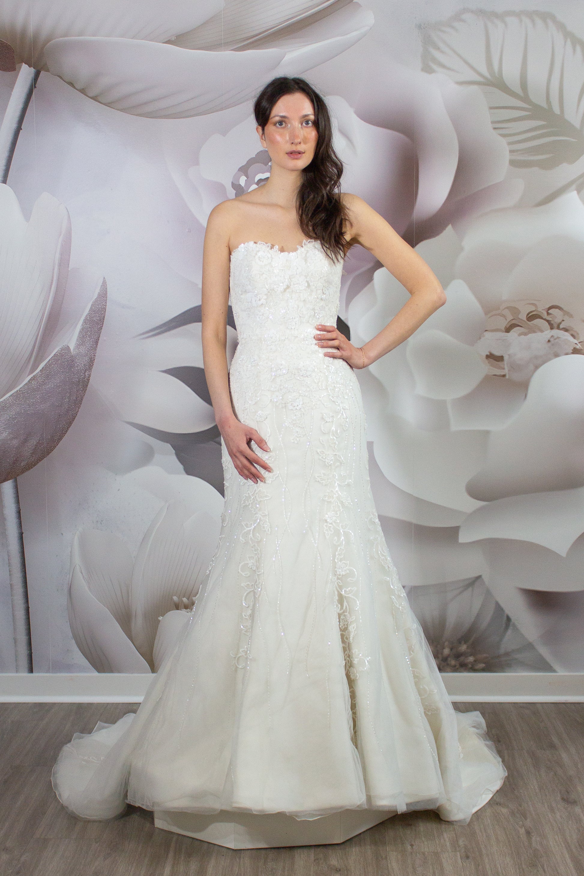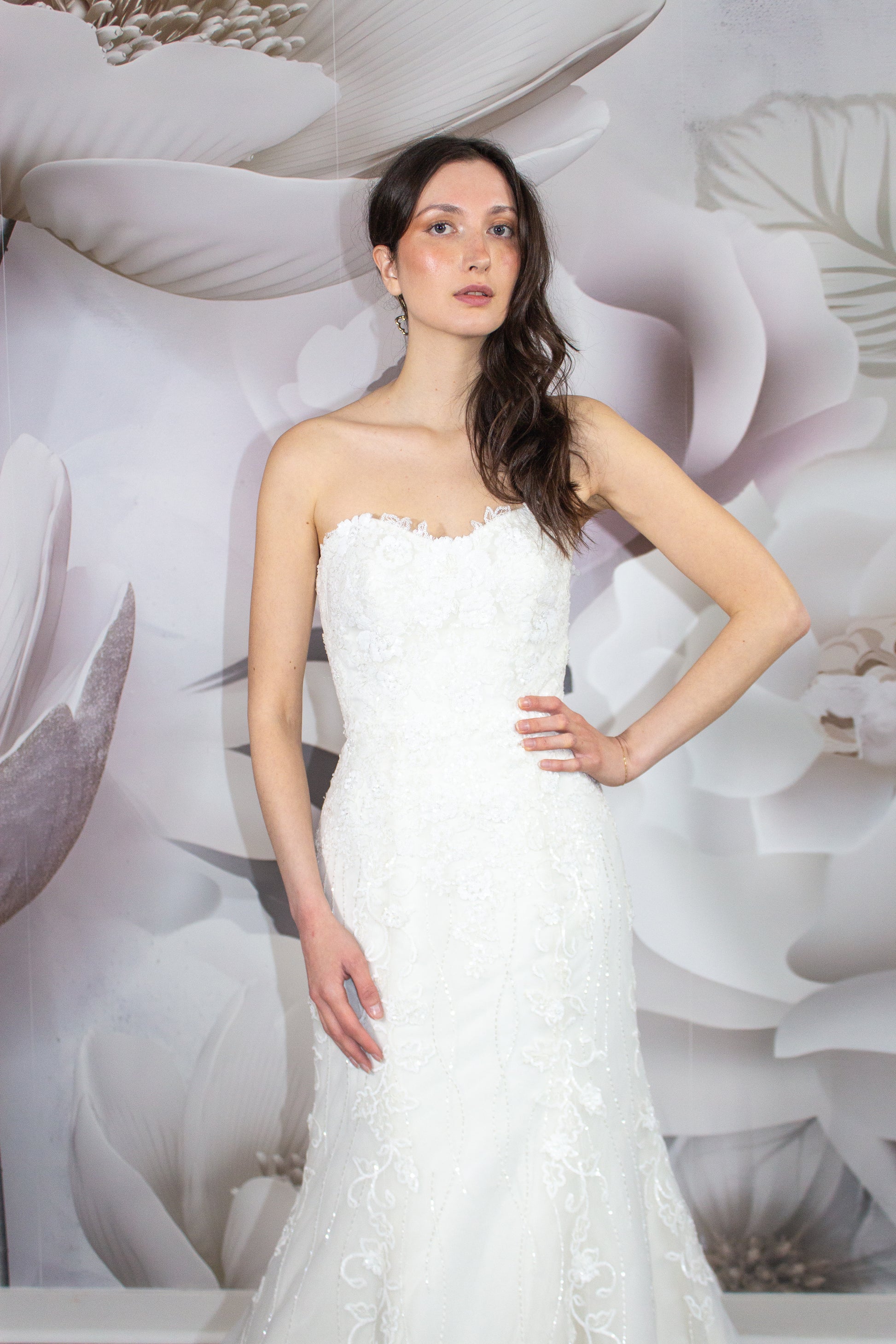 Step into the elegance and luxury of the KYHLA Bridal Gown, a masterpiece from our exclusive made in Italy Nicole Milano Collection. This stunning wedding dress exudes sophistication with its mermaid silhouette that accentuates your curves effortlessly. The strapless neckline adds a touch of glamour, while the intricate lace and hand sewn beading embellishments sparkle delicately under the lights.