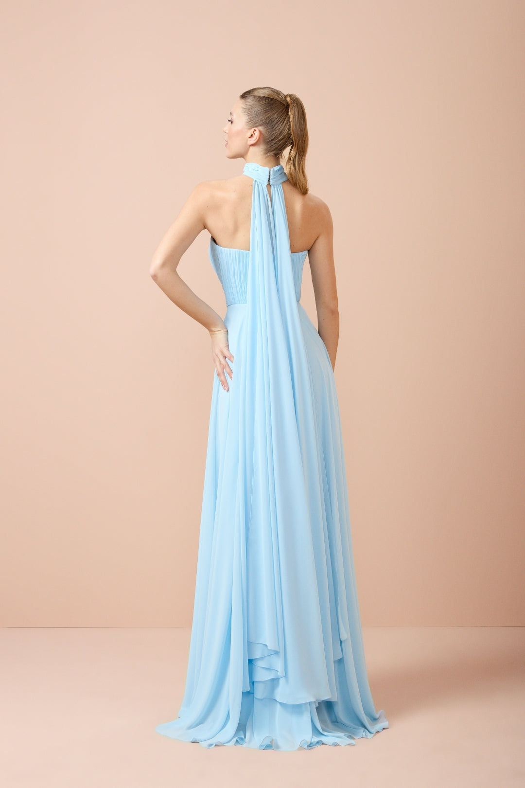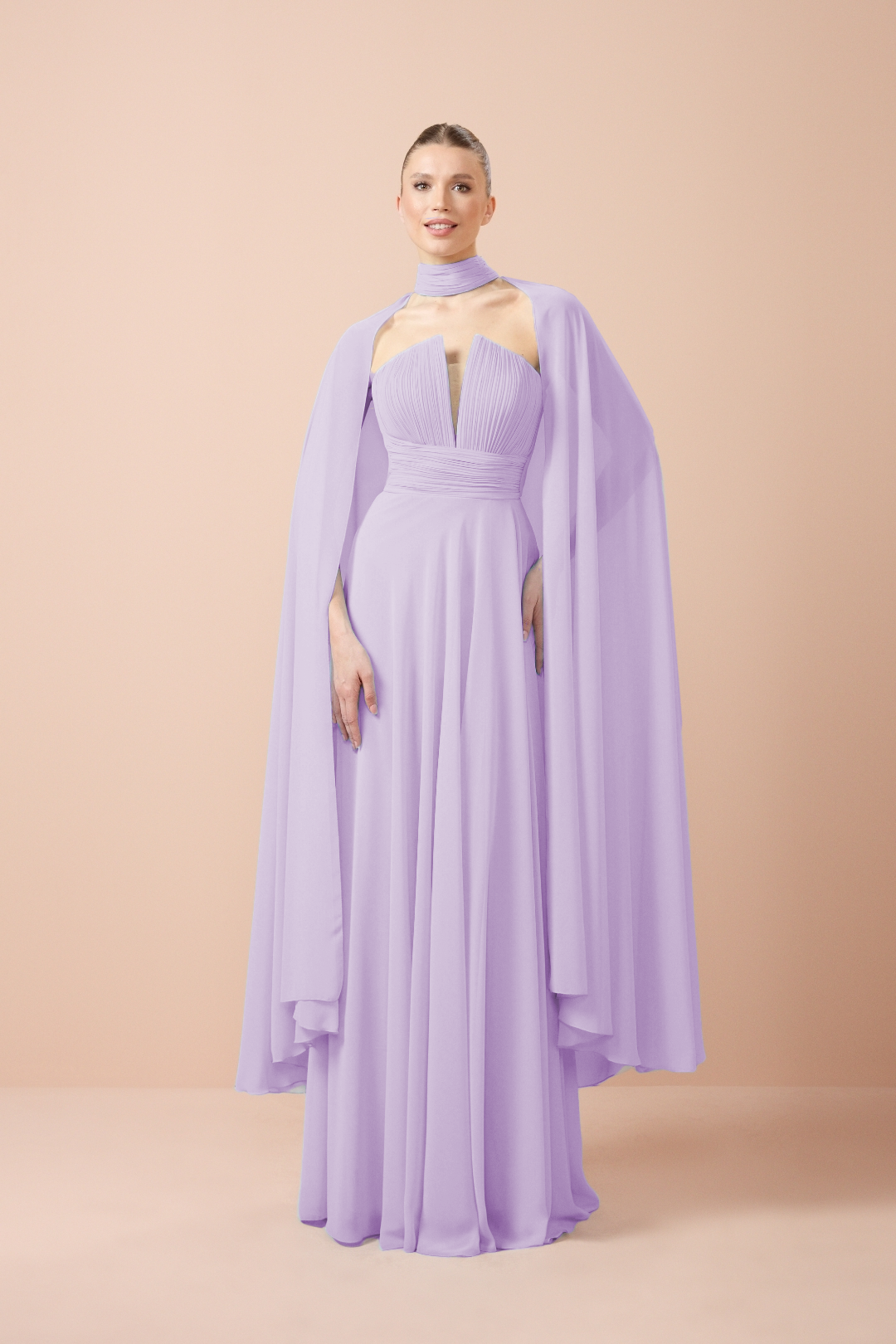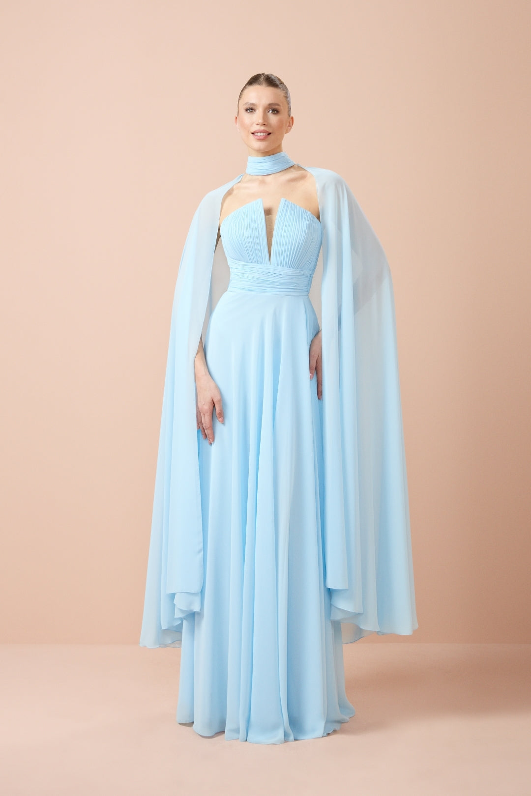 ODETTE chiffon evening gown designed to captivate with a deep plunging sweetheart neckline, sharply pleated bodice, and a cinched waist that sculpts the figure. A fluid A-line skirt flows effortlessly to the floor, while the sheer detachable cape adds bold, ethereal drama with every step. The scarf-style halter wraps at the neck and cascades down the back, creating a striking silhouette from every angle. Finished with a concealed back zipper and structured cup support, this gown blends elegance with statement-making design—perfect for galas, red carpet events, or modern bridesmaids.