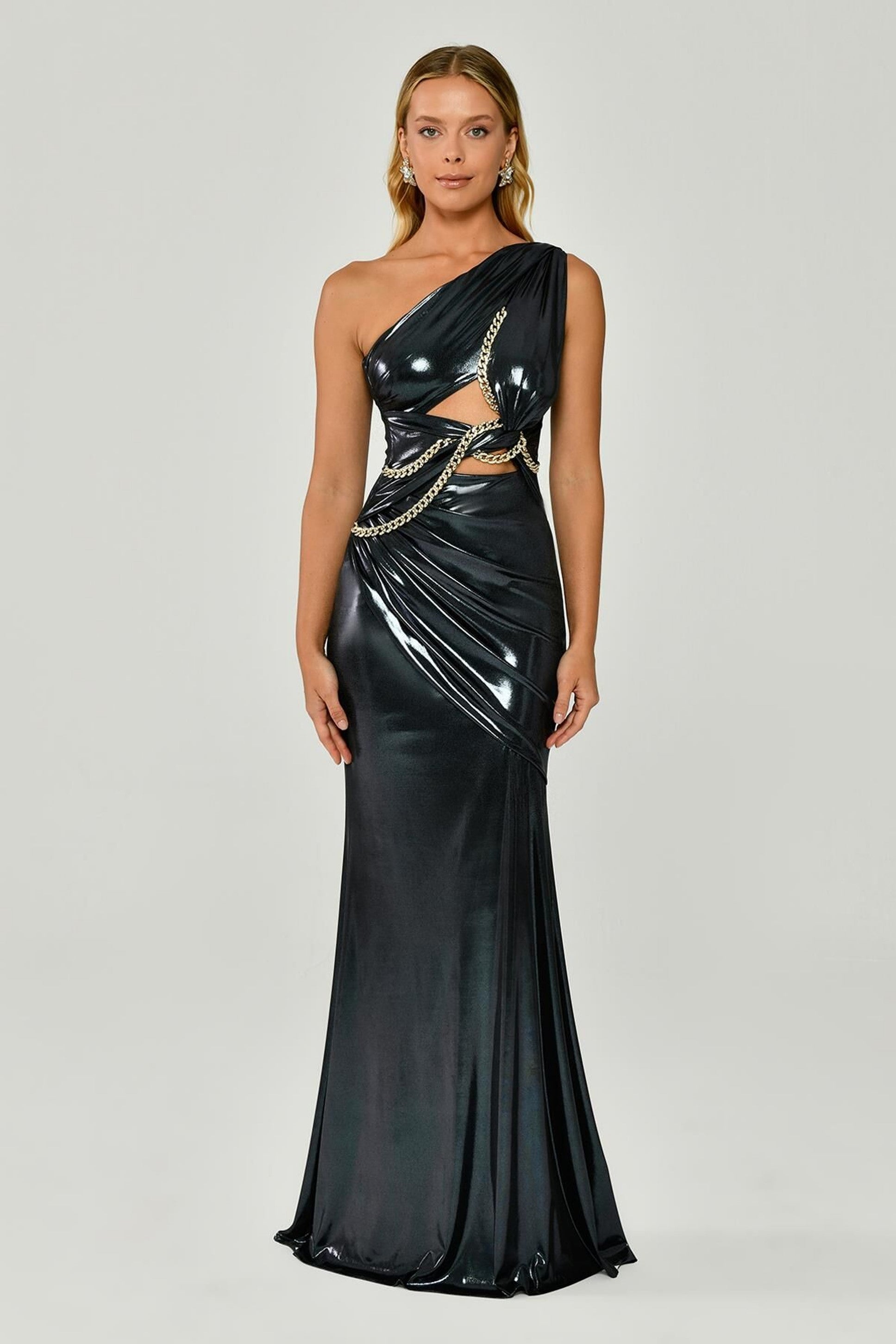 Introducing AVA ! Our One Shoulder Metallic Gown with Gold Chain Detailing