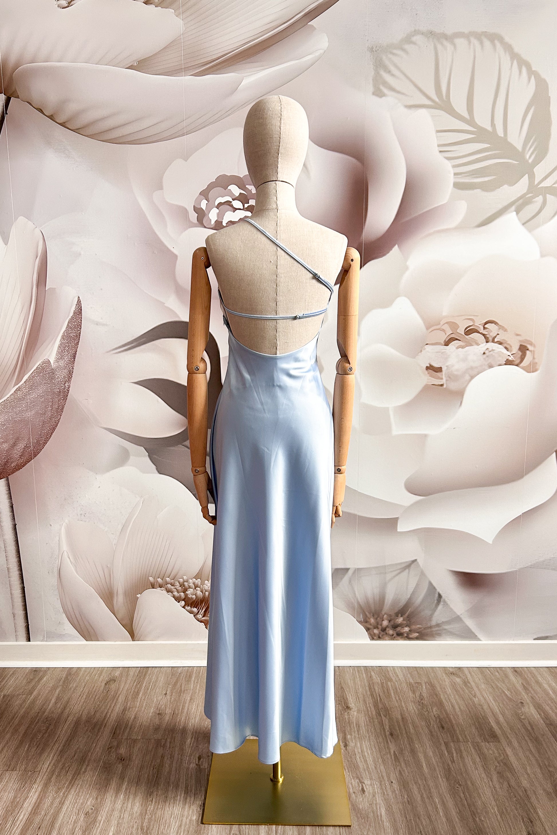 The open back creates a striking contrast to the minimal front design, giving the dress an effortlessly elegant look. A subtle front slit allows for graceful movement while maintaining a refined and polished silhouette.