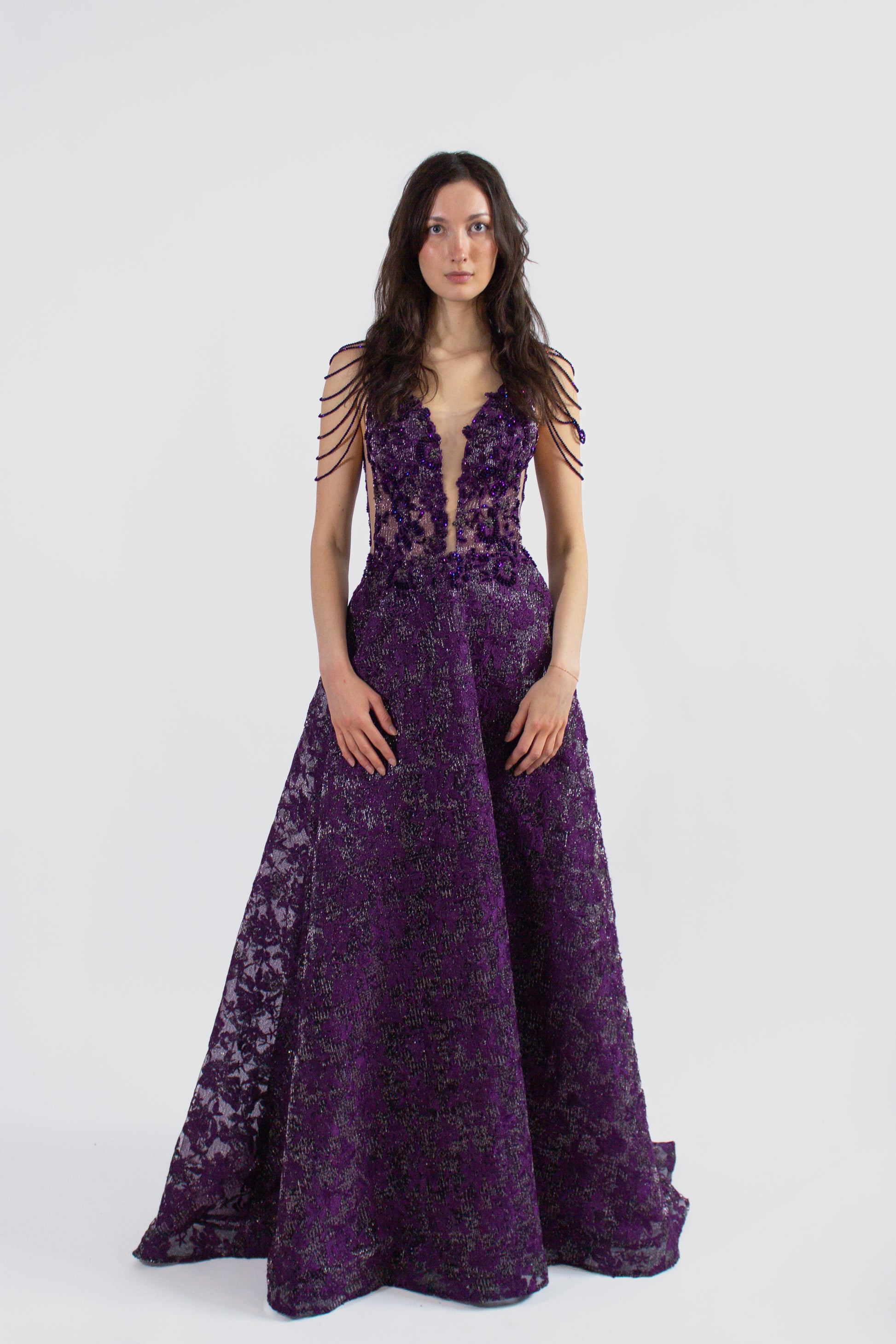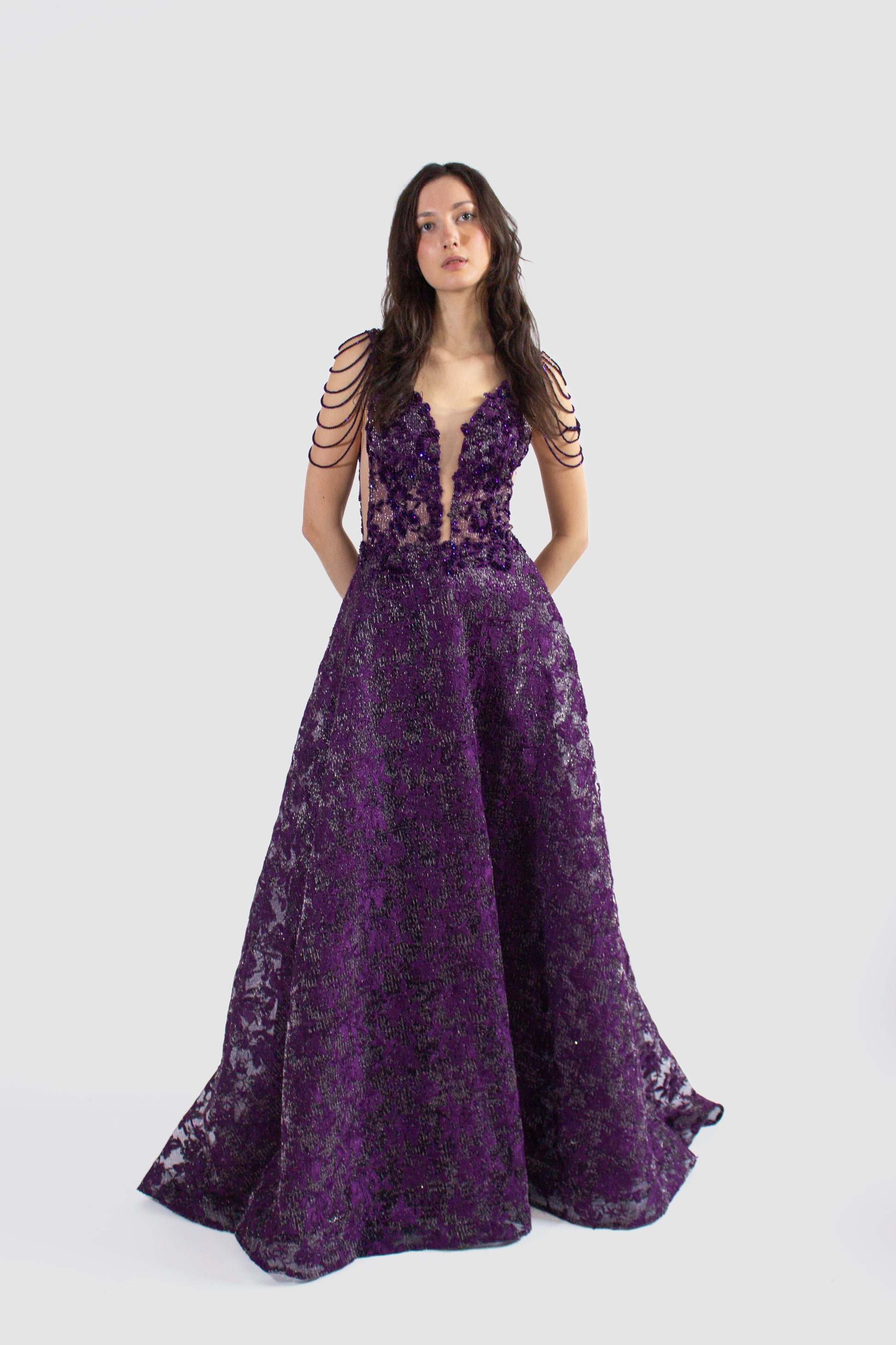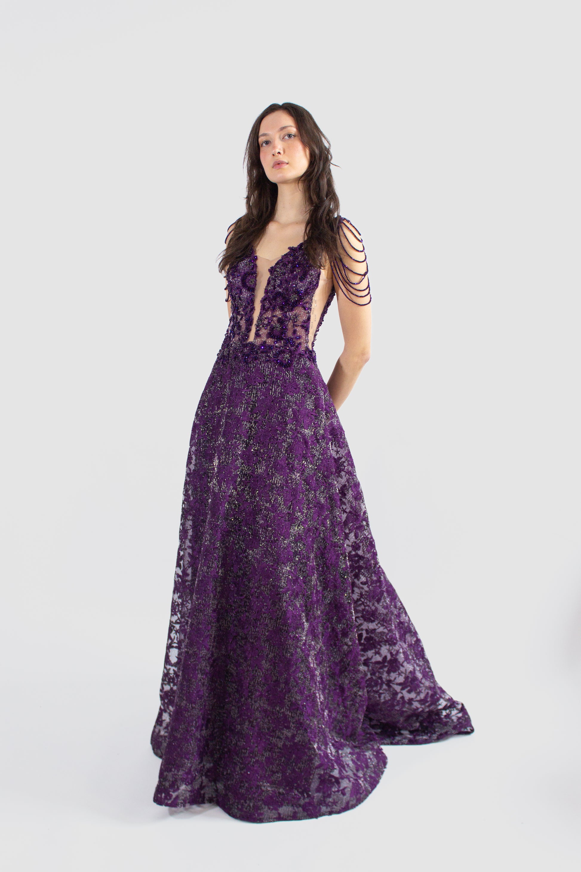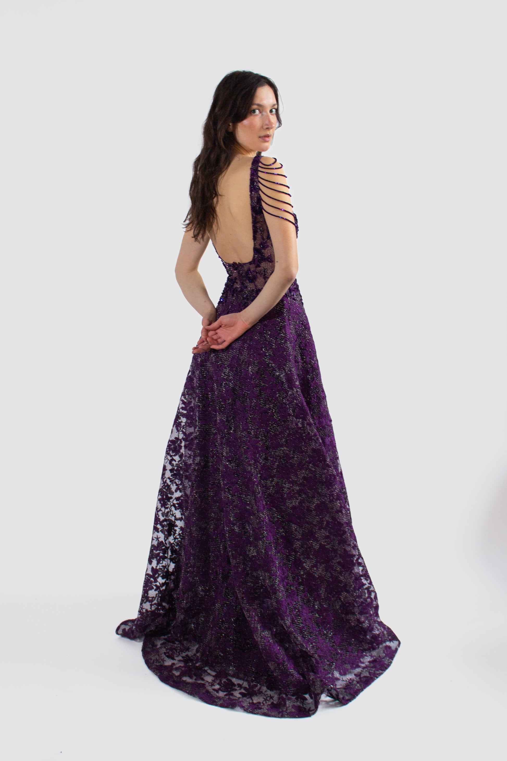 Elevate your evening look with our alluring ORELIA backless gown, available in captivating purple or shimmering silver. The floor-length design exudes elegance, perfect for any formal occasion.