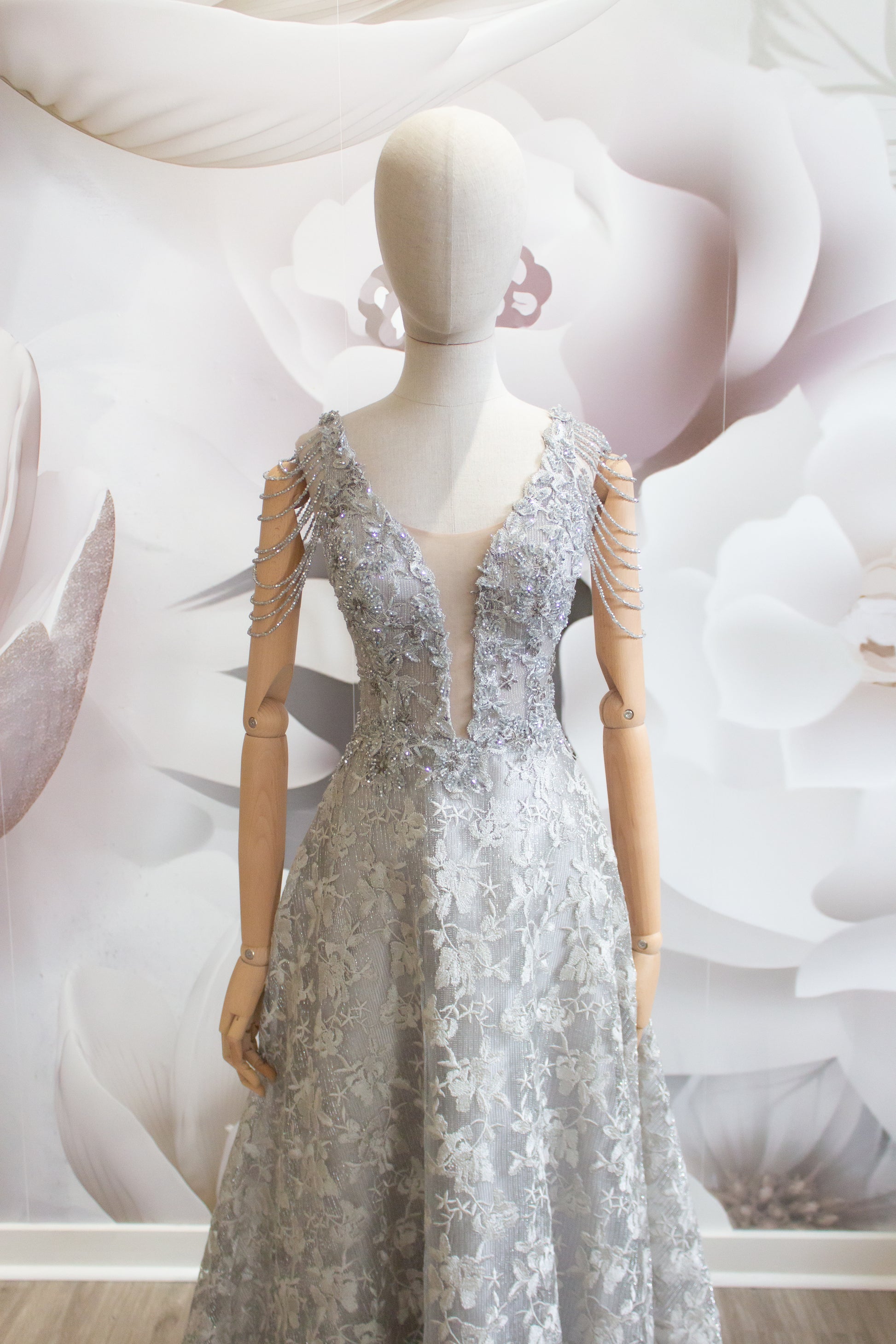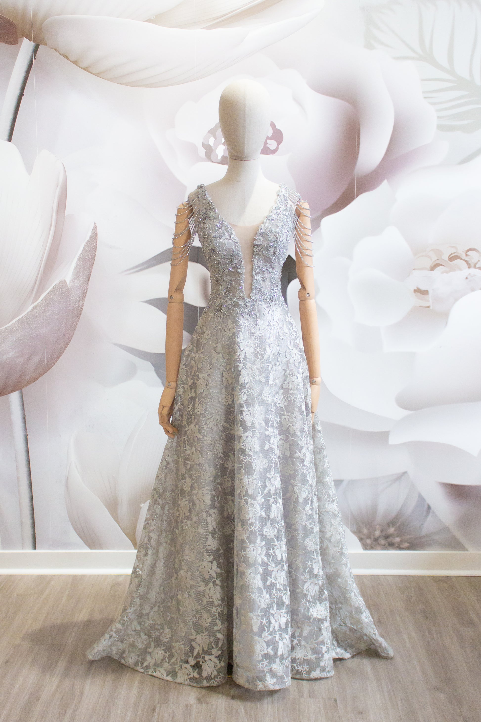 This sleeveless dress features a deep V-neckline that adds a touch of sophistication, while the intricate lace details with floral patterns showcase a blend of style and grace. The open back with straps creates a stunning visual appeal.
