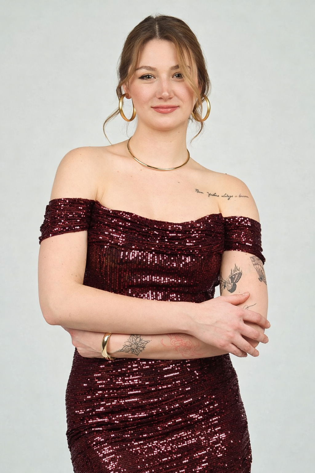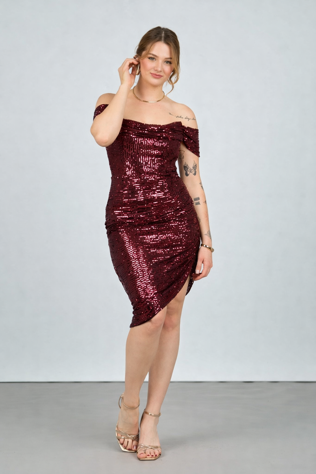 Make an entrance in PAIGE, a full-sequin off-the-shoulder cocktail dress designed to shine from every angle. This sleek, body-contouring silhouette features a softly draped neckline that highlights the shoulders and collarbone while the fitted midi length elongates the figure for a confident, polished look. The subtle wrap-style skirt adds movement and dimension, creating a flattering shape that feels both glamorous and effortless. Perfect for cocktail parties, engagement celebrations, holiday events, and evening receptions, PAIGE is your go-to dress for standout style with refined elegance.