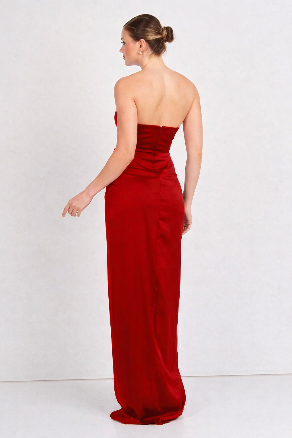 Turn heads the moment you enter the room in the PEARL gown, a striking strapless silhouette designed to highlight and define your shape. The structured corset-style bodice creates a smooth, sculpted fit through the waist, while the softly draped ruching adds a flattering, feminine touch. A bold thigh-high slit brings movement and drama, making this gown as captivating from every angle as it is confident.