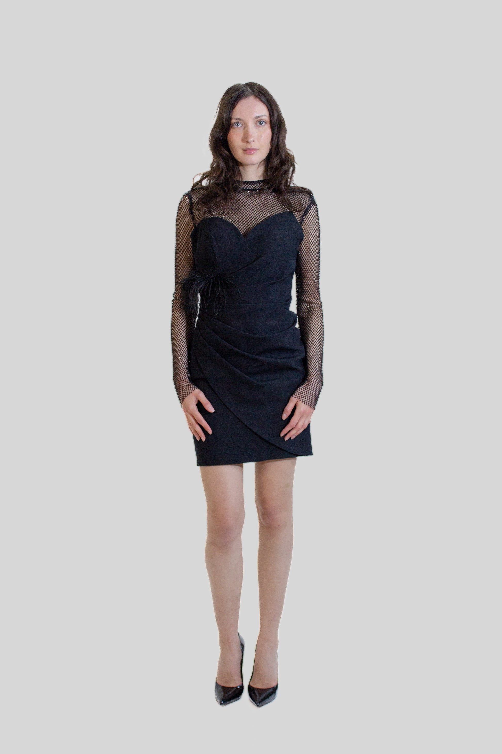 Designed with a round neckline adorned with mesh accents, this dress exudes a contemporary charm. The feather details on the waist add a subtle yet glamorous touch, making you the center of attention wherever you go.