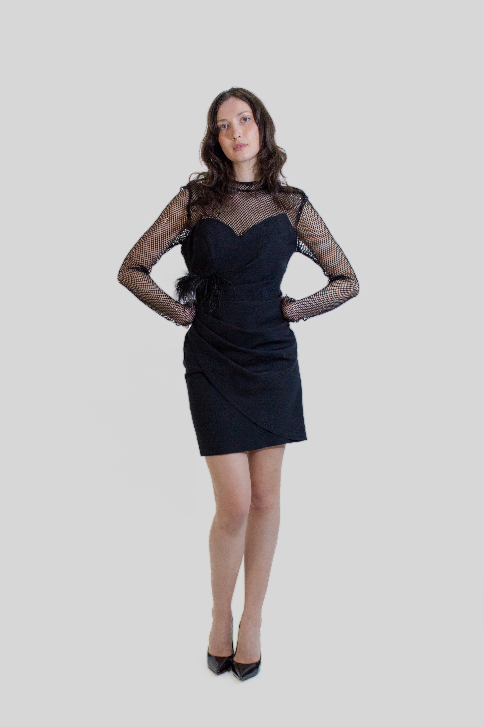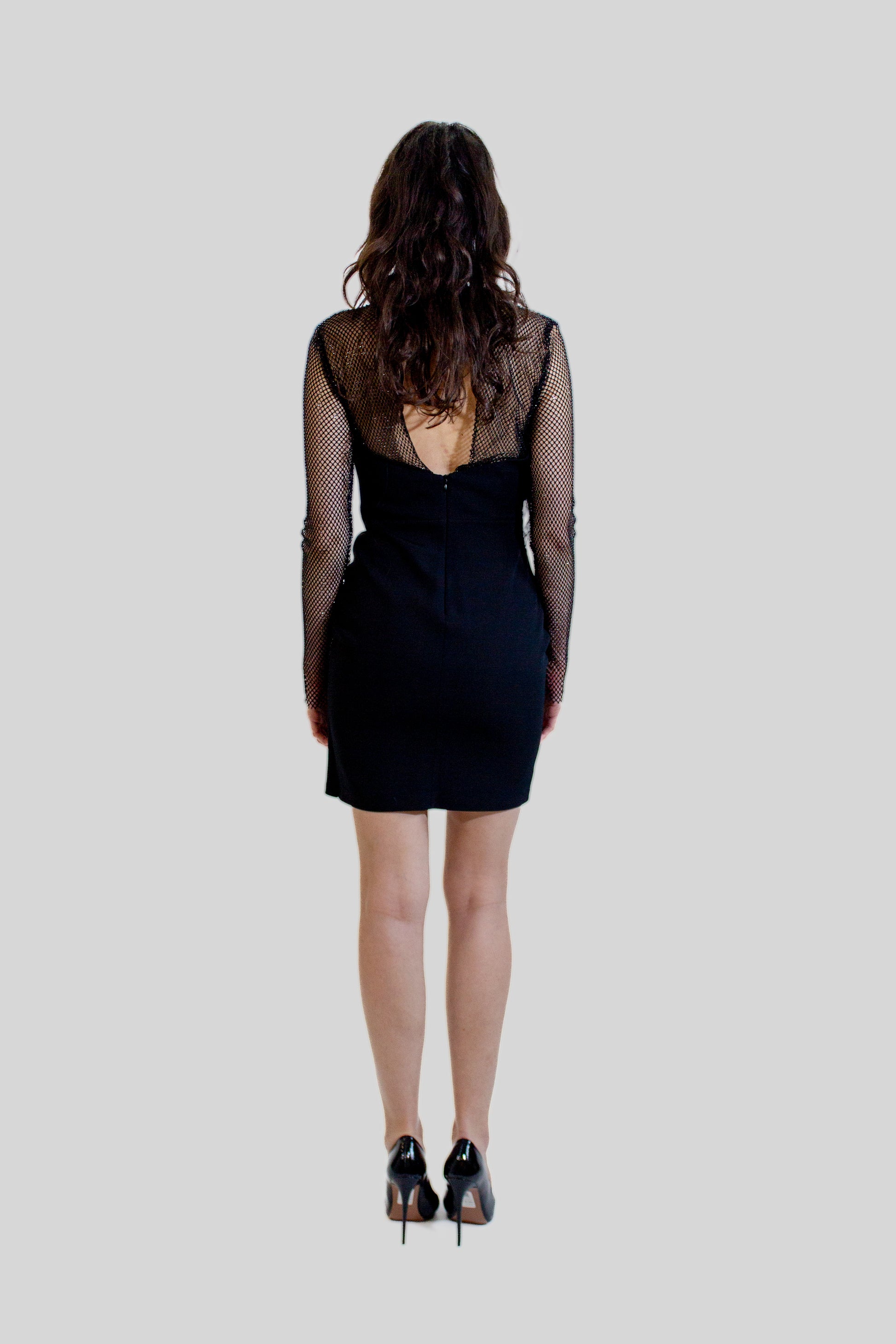 Elevate your evening look with this sophisticated RAVIN black cocktail dress. The dress features long sleeves with delicate mesh detailing, adding a touch of elegance to your ensemble. The short length and open back design create a modern and chic silhouette, perfect for any special occasion.