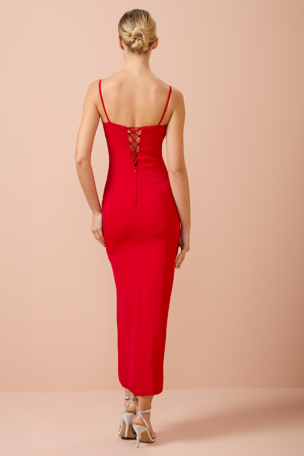 Sophisticated midi gown featuring delicate spaghetti straps and a sweetheart neckline. This fitted formal dress boasts unique crisscross cutout detailing at the waist and a stylish high slit. Ideal as an evening dress, cocktail dress, or special occasion dress, this sleeveless silhouette offers a modern and elegant appeal. Explore this chic midi formal gown for your next event.