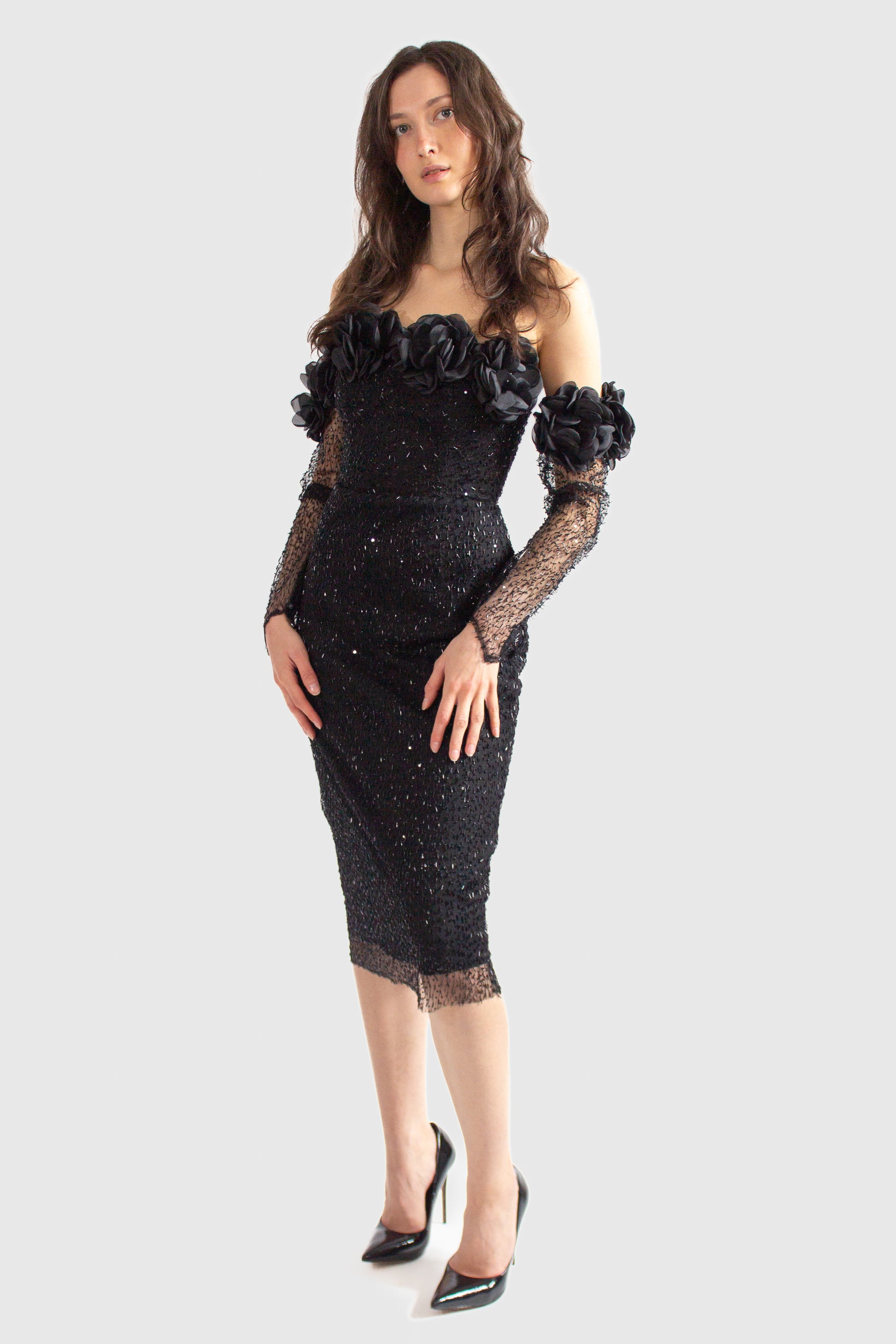 Hand-beaded fabric shimmers with every move, catching the light and creating an aura of pure enchantment. Delicate floral details adorn the sleeves and neckline, adding a touch of romantic whimsy.