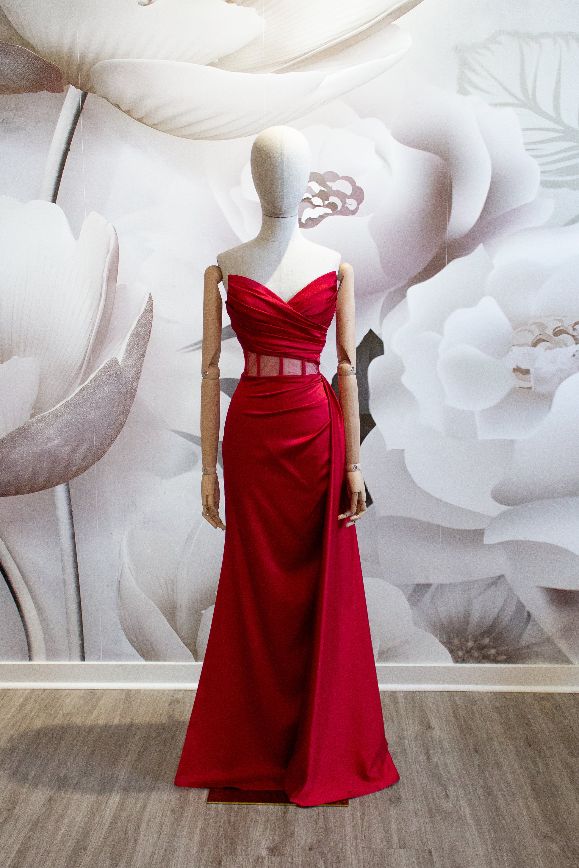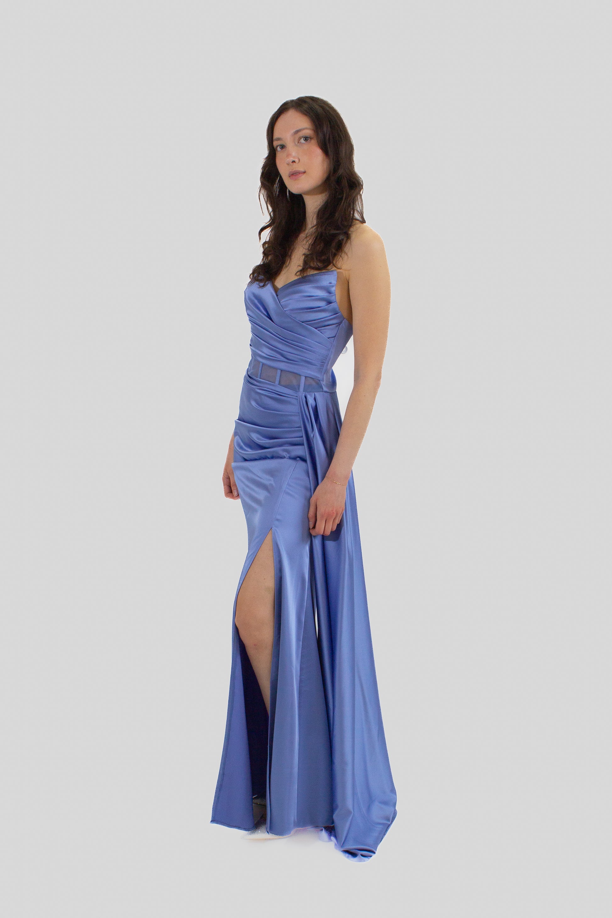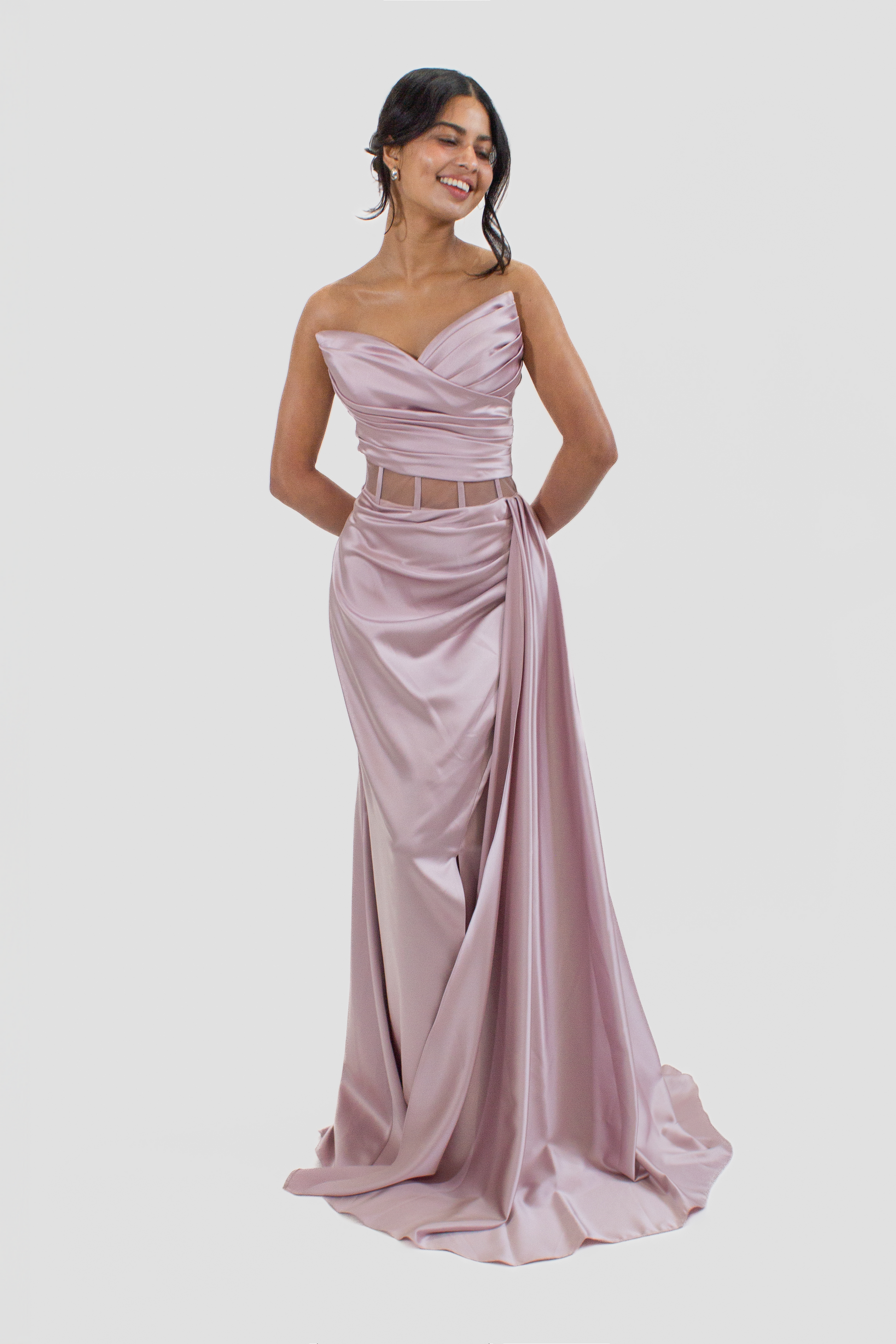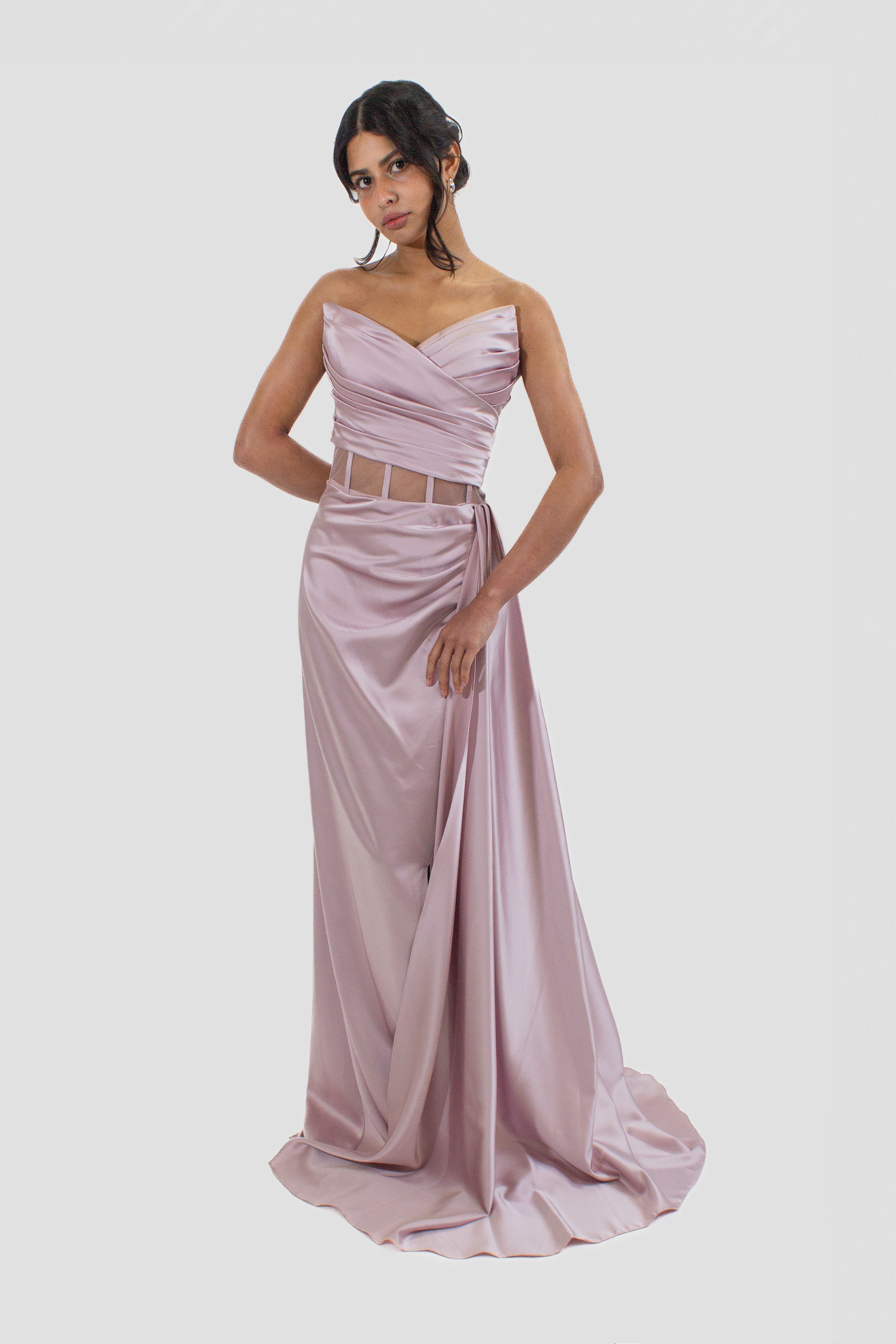 This strapless gown showcases a stylish rushed bodice, a waistband with sheer panels, and a draped skirt with a chic slit that adds a touch of allure to your look.