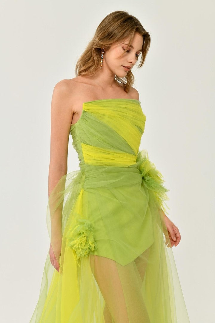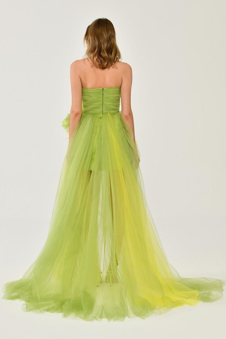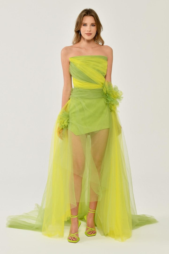 Introducing MIA our Green Two-Tone Tulle Dress: a delightful blend of elegance and playfulness. Crafted with meticulous attention to detail, this strapless wonder features a lush green hue transitioning into a lighter tone, creating a mesmerizing two-tone effect. The luxurious tulle overlay gracefully cascades down to the floor, enhancing the dress's unique silhouette. Perfect for weddings, outdoor events, and proms, this enchanting dress ensures you'll stand out with its fun and distinctive style. Elevate your eveningwear collection and embrace the joy of individuality with our Green Two-Tone Tulle Dress
