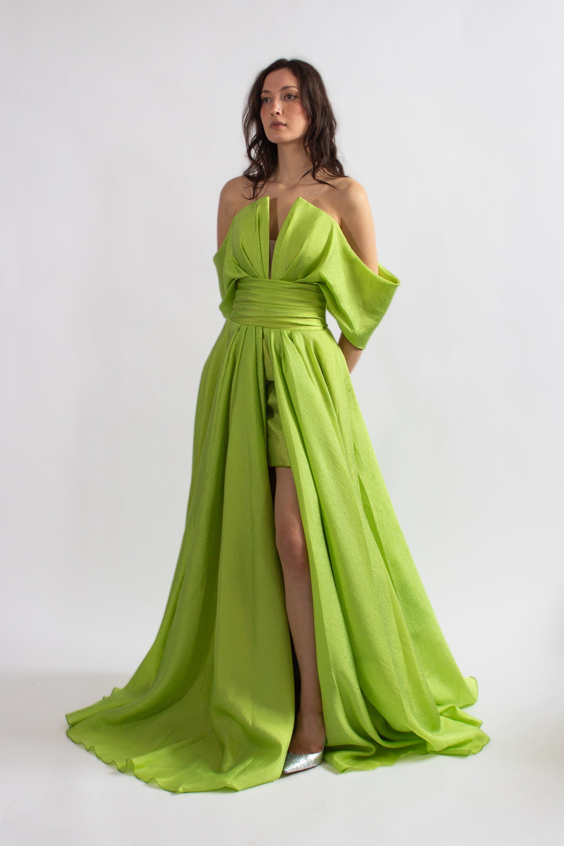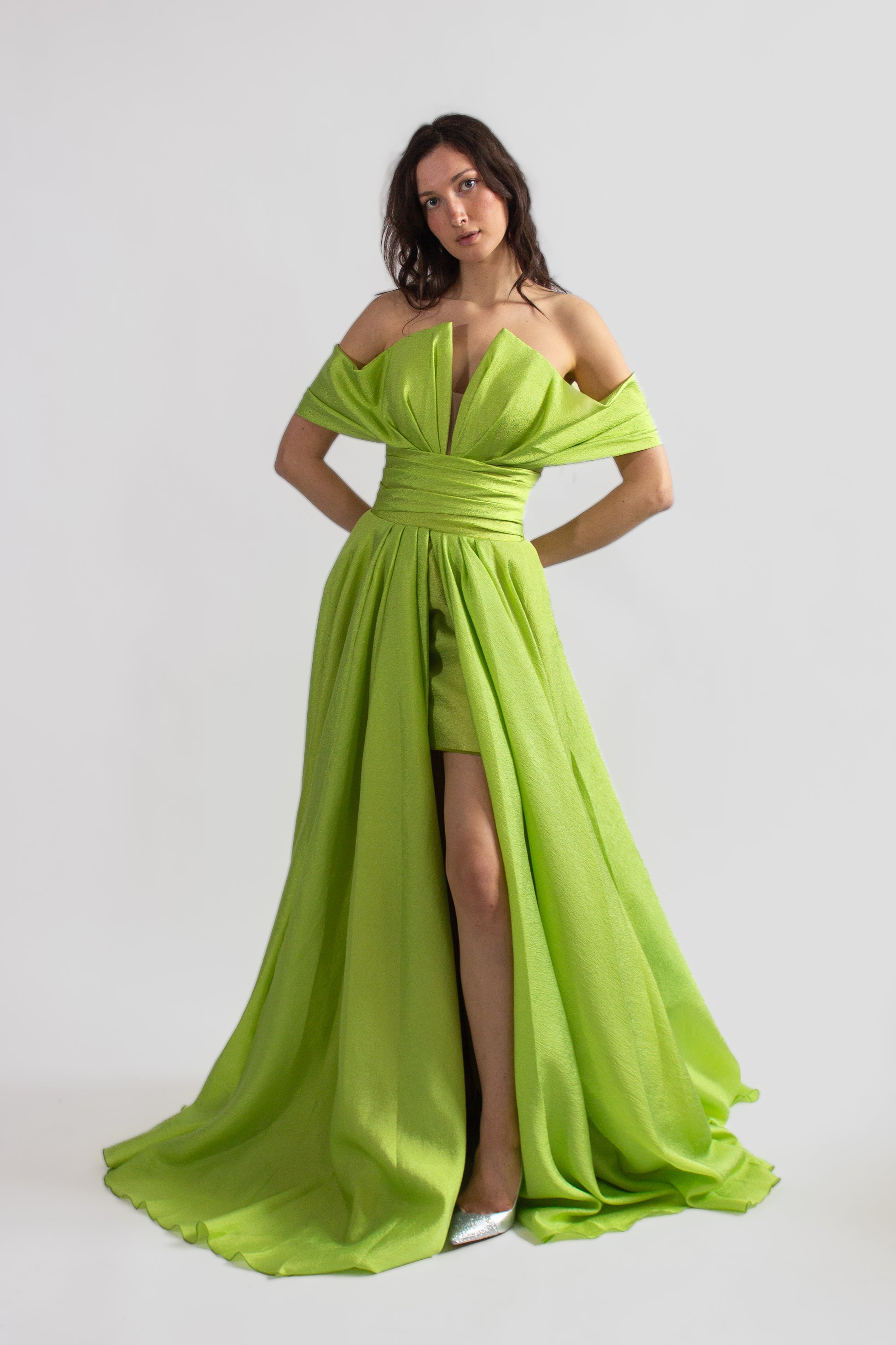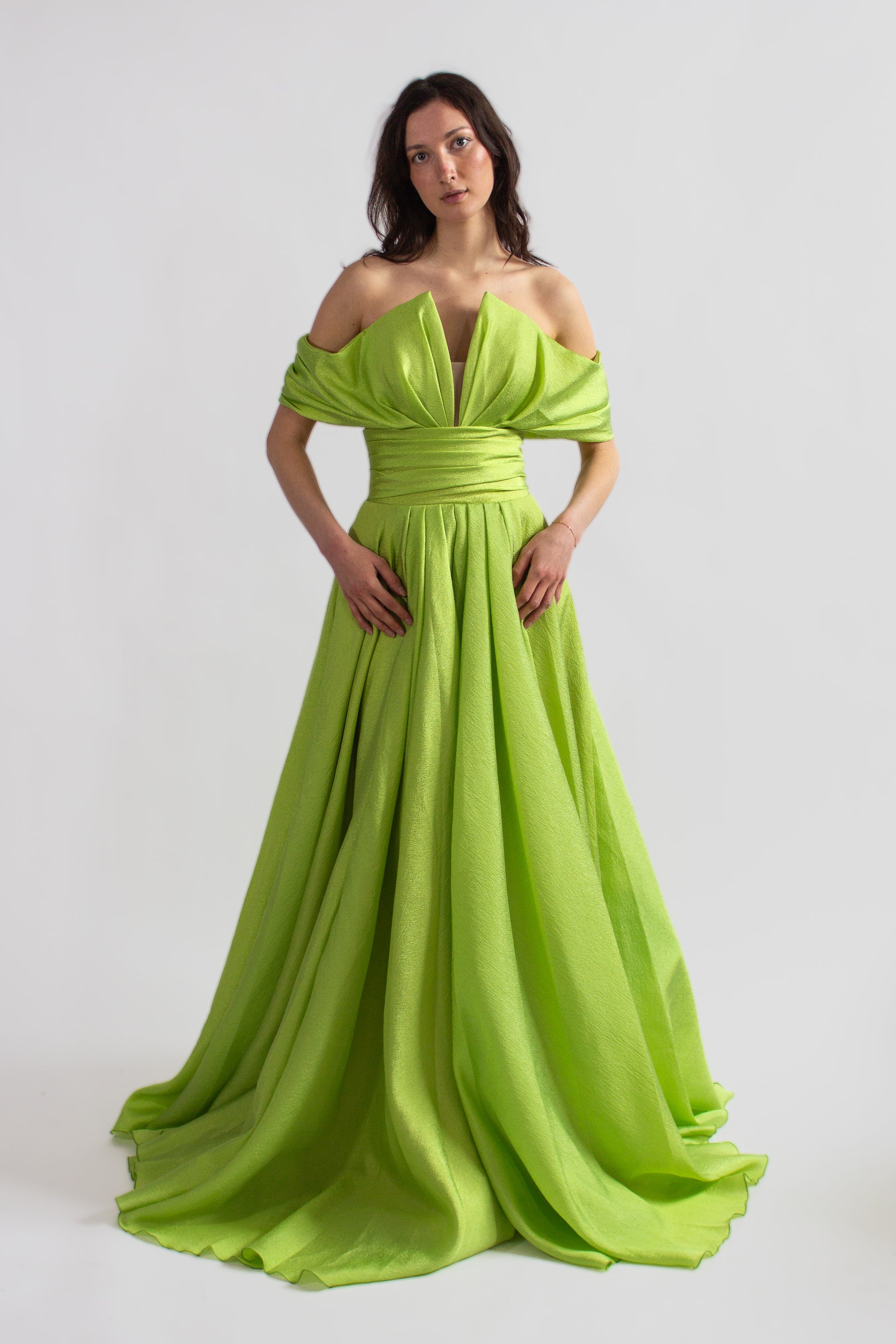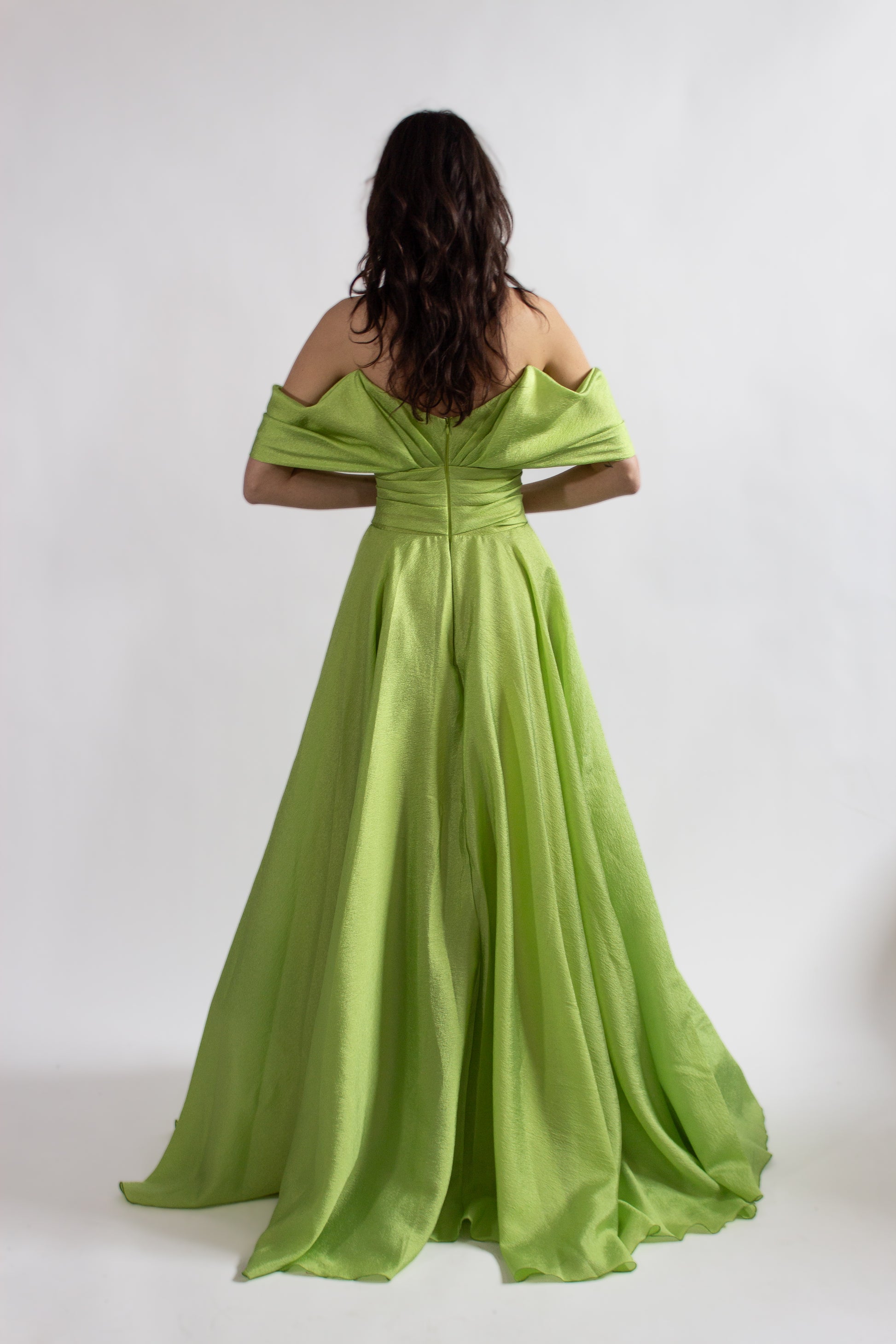 The green color of this gown is both bold and sophisticated, perfect for making a stylish statement at any special event. The sweetheart neckline and draped sleeves enhance the overall glamour of the outfit, while the flowy fabric, possibly silk or satin, ensures a graceful and enchanting drape.