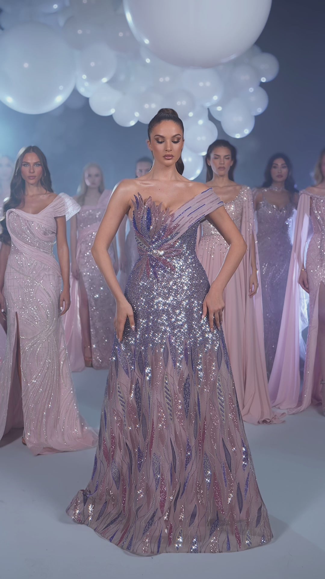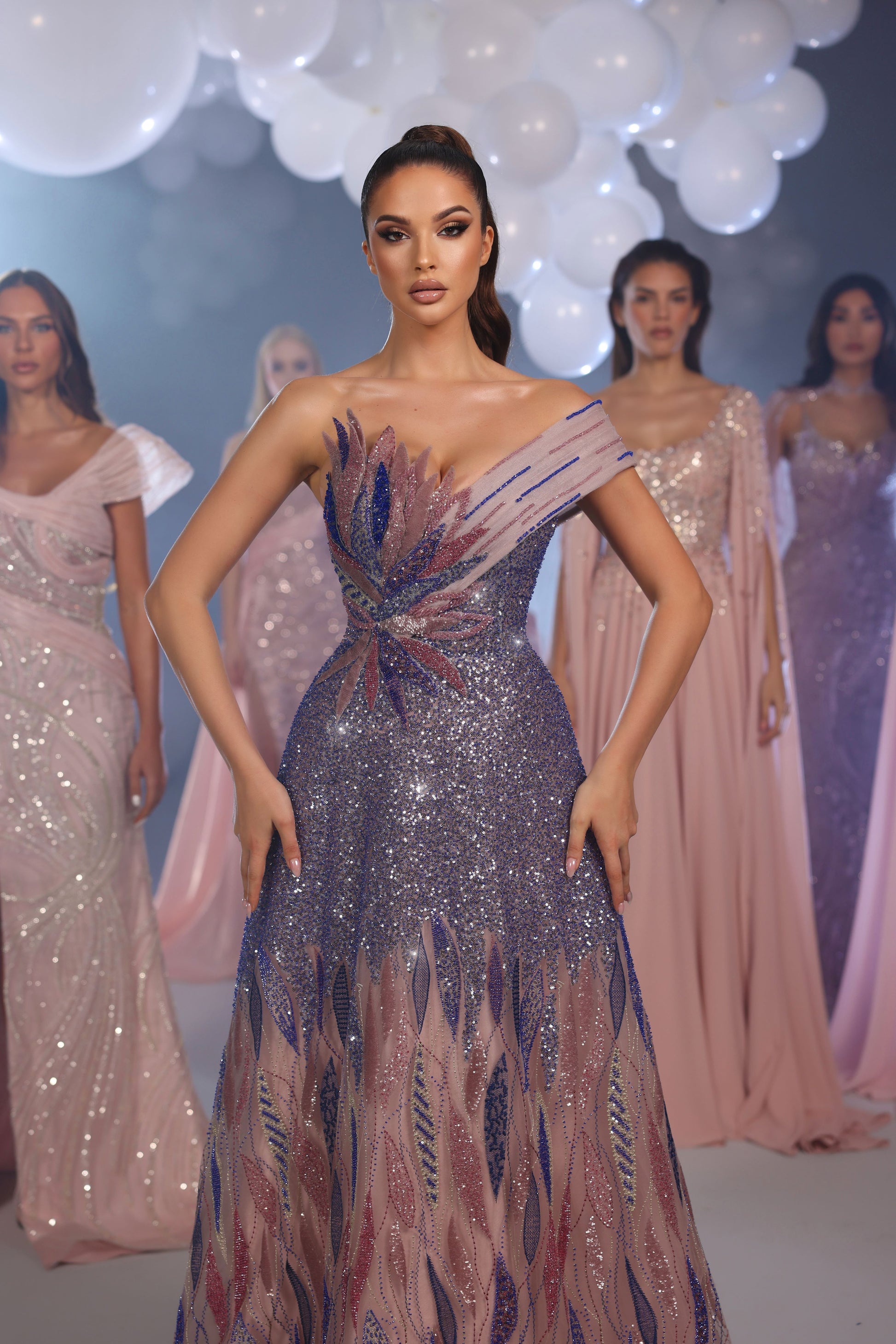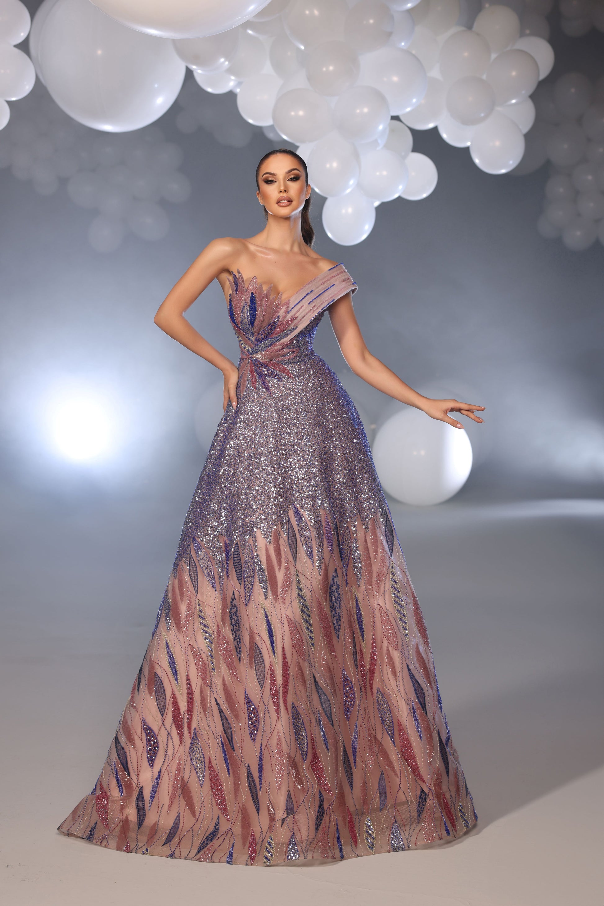 The intricate embellishments create a feather-like design that adds a touch of whimsical elegance to the garment. Featuring a mesmerizing one-shoulder neckline and a single sleeve, this gown exudes a sense of grace and sophistication.