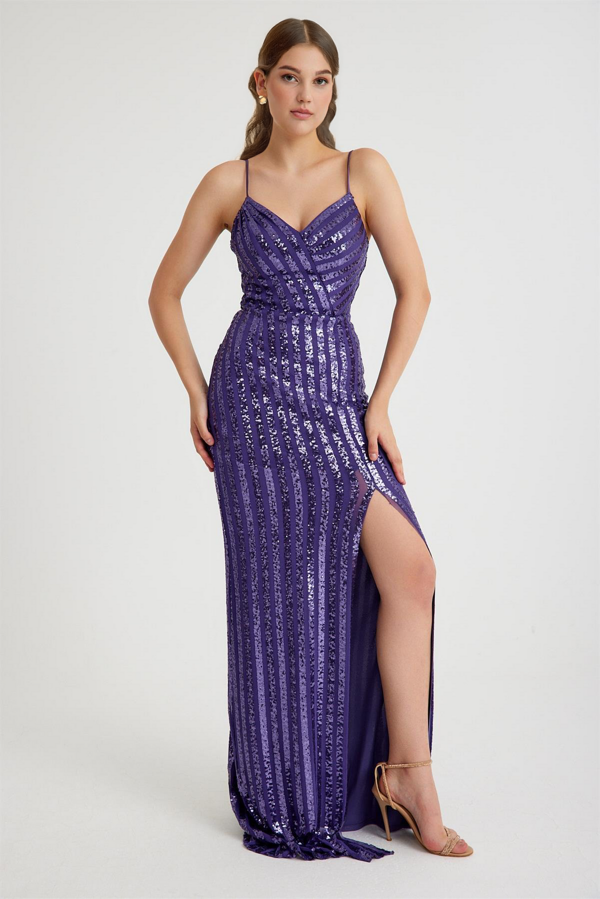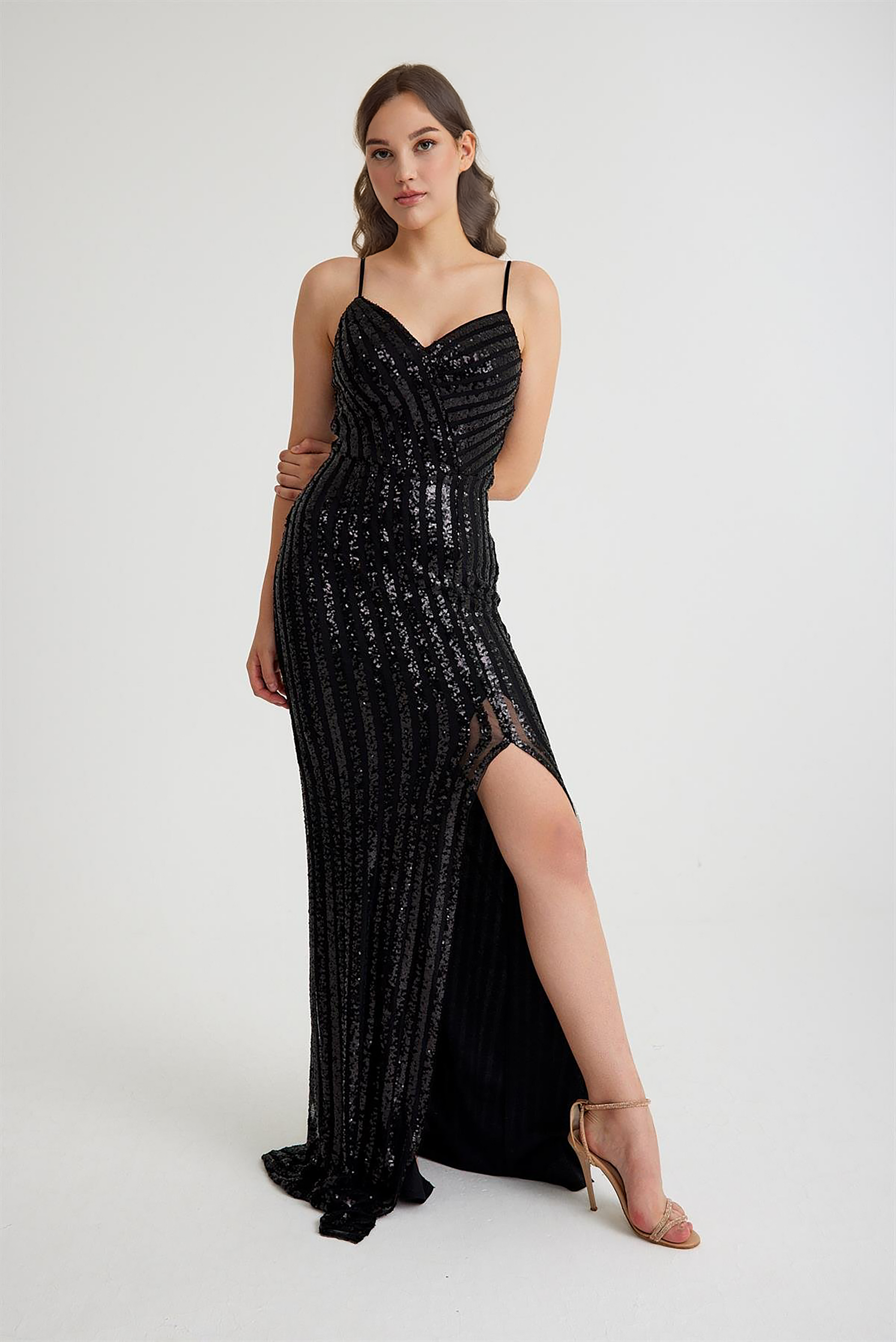 Elevate your evening look with our breathtaking floor-length gown in a graceful shade of purple or black. The gown features elegant spaghetti straps and a fitted silhouette that accentuates your curves beautifully. Adorned with shimmering sequins, this gown exudes glamour and sophistication, making it the perfect choice for any formal event or special occasion. A daring front slit adds a touch of allure, ensuring you stand out with every step you take in this stunning piece.