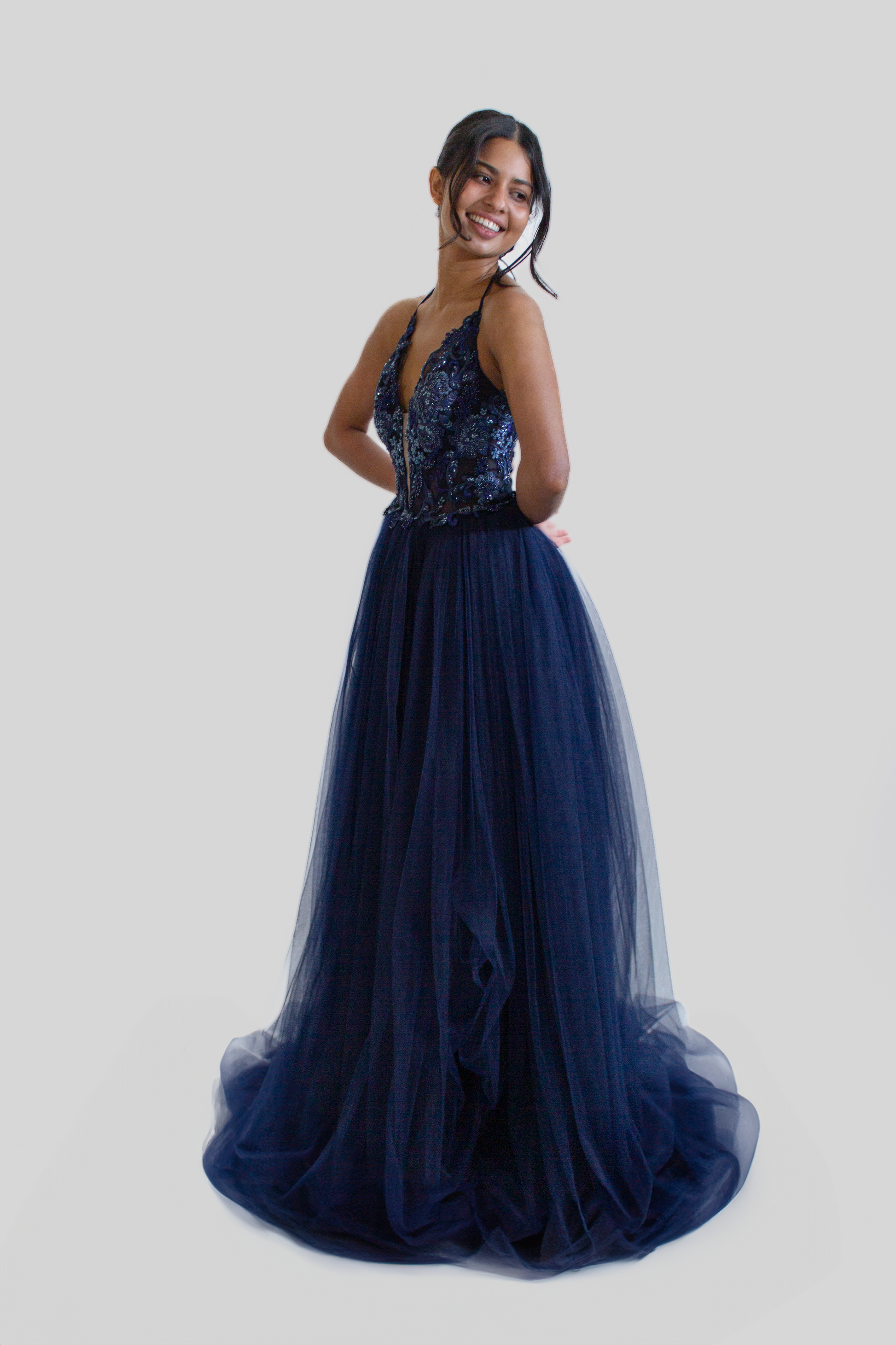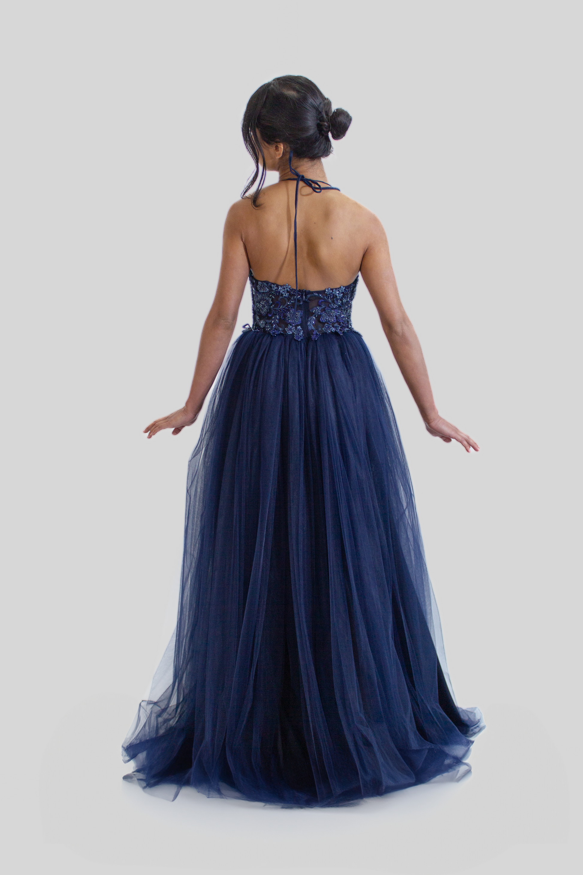Crafted from delicate tulle with intricate hand sewn sequin embroidery, this gown exudes elegance and sophistication. The halter neck style adds a touch of allure, framing your shoulders beautifully and adding a modern twist to a classic silhouette.