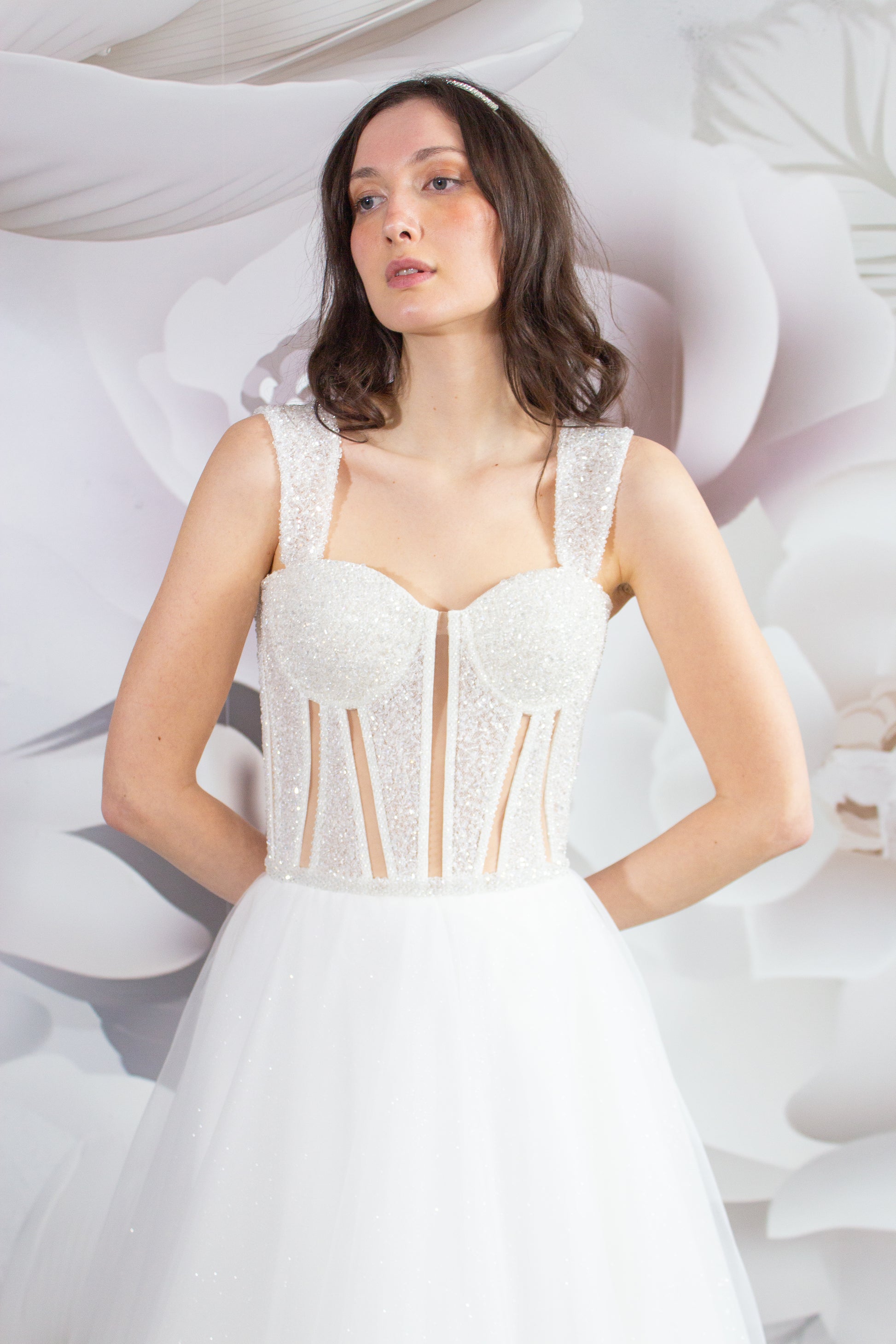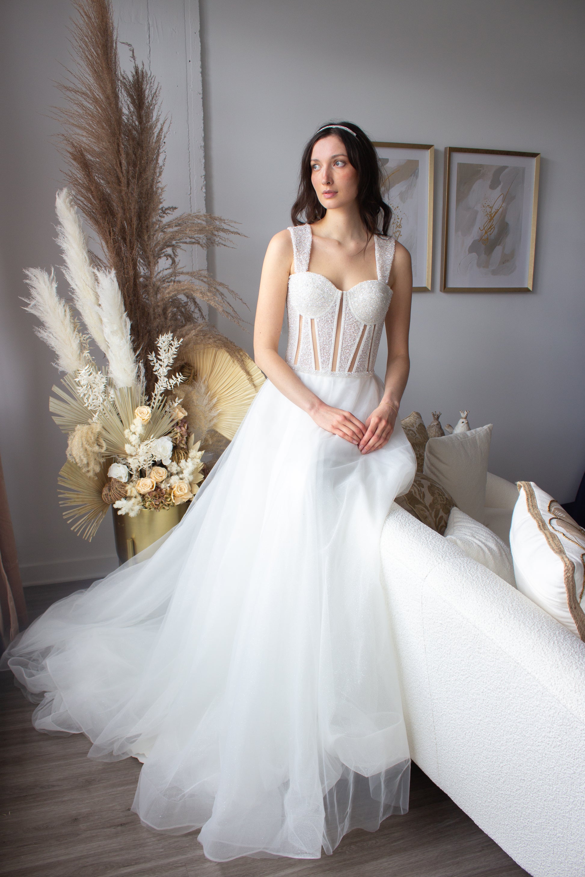 Step into elegance with our Maya bridal gown, meticulously tailored to your measurements within 6 weeks. This captivating piece showcases a delightful fusion of sophistication and glamour that is bound to make your special day even more memorable.