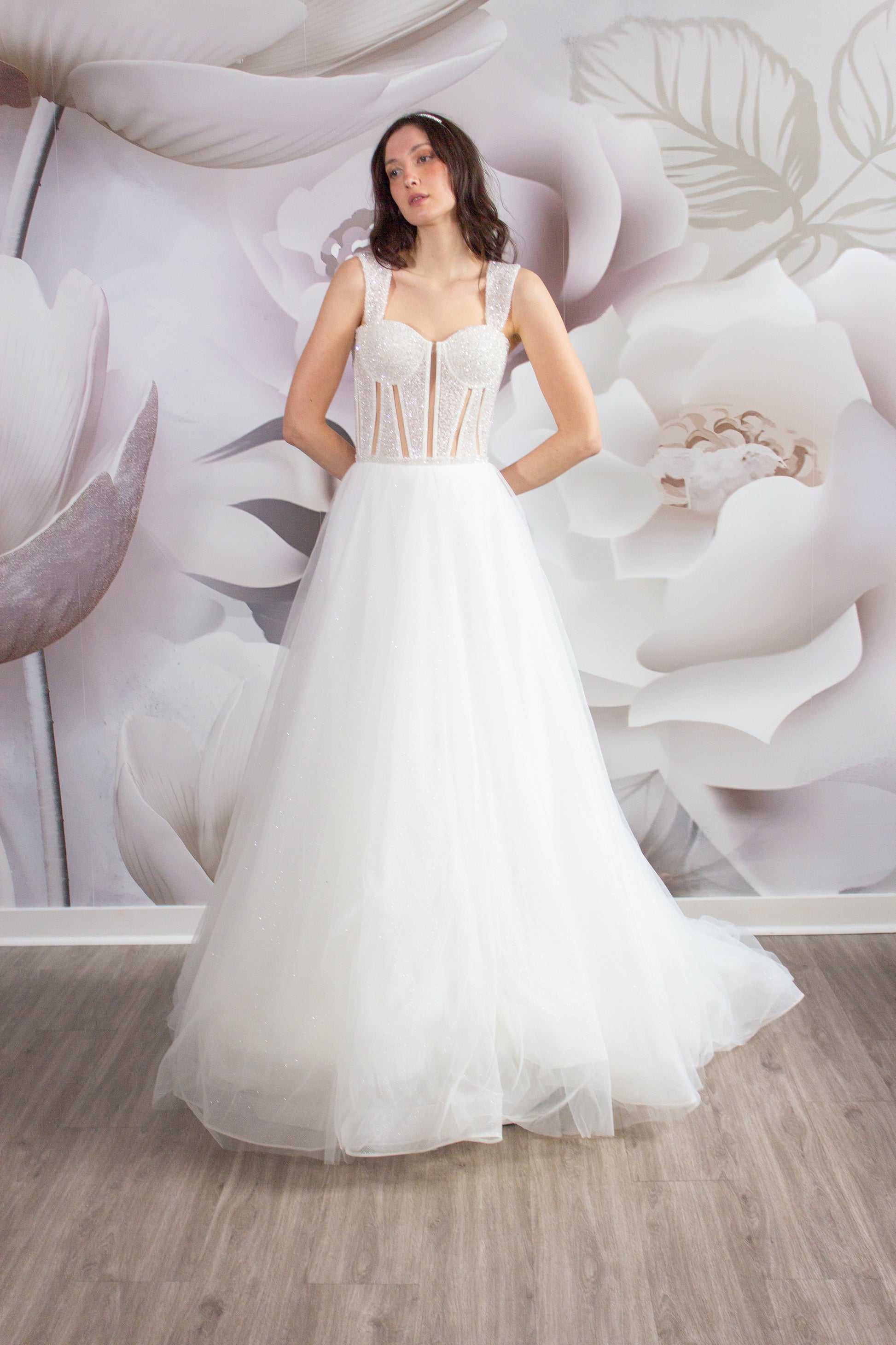 The corset-style top adorned with intricate handsewn beading and sequins complements the flattering A-line silhouette exquisitely. The sleeveless design and sweetheart neckline enhance the romantic charm of the gown, while the full-length tulle skirt adds a touch of ethereal beauty.