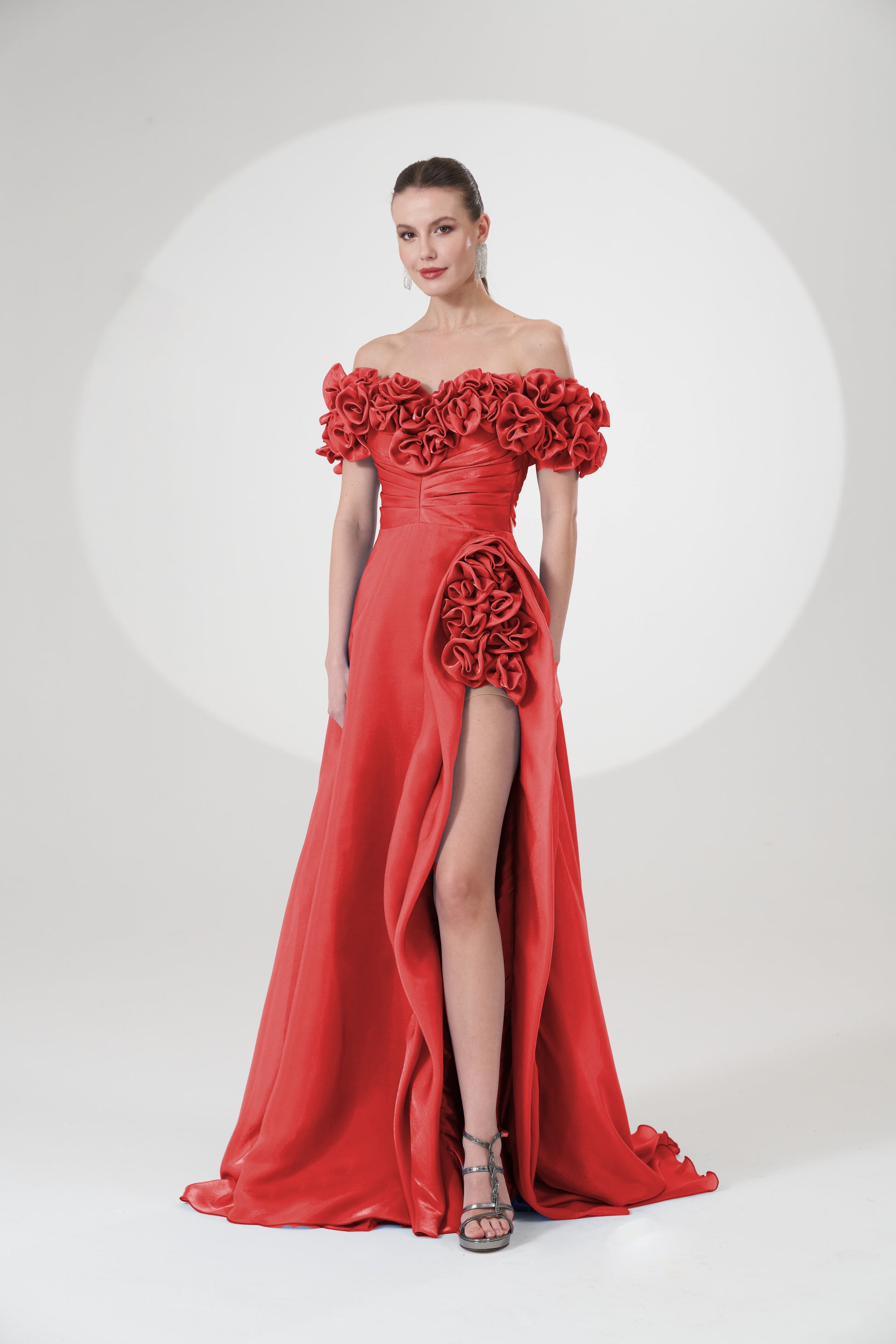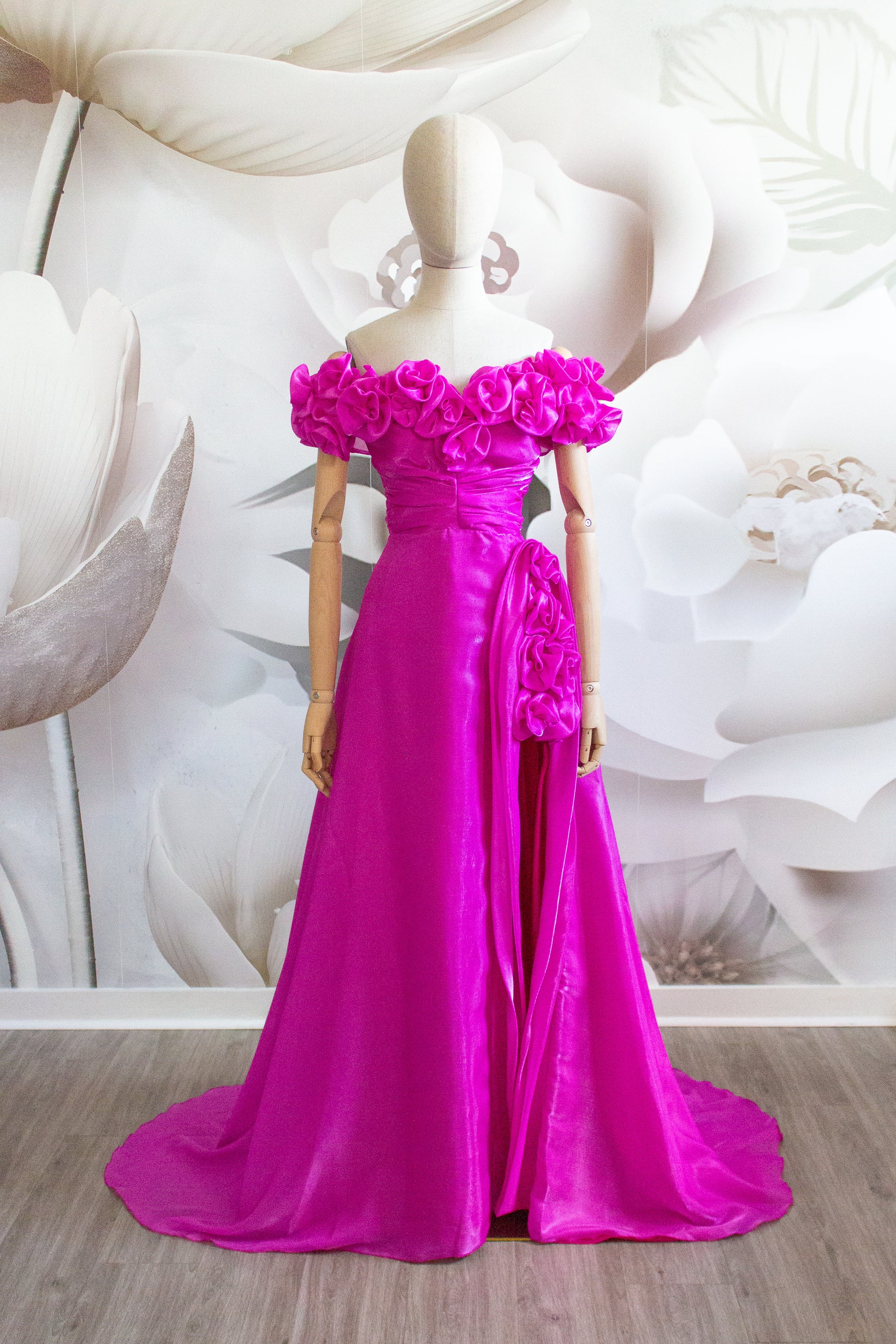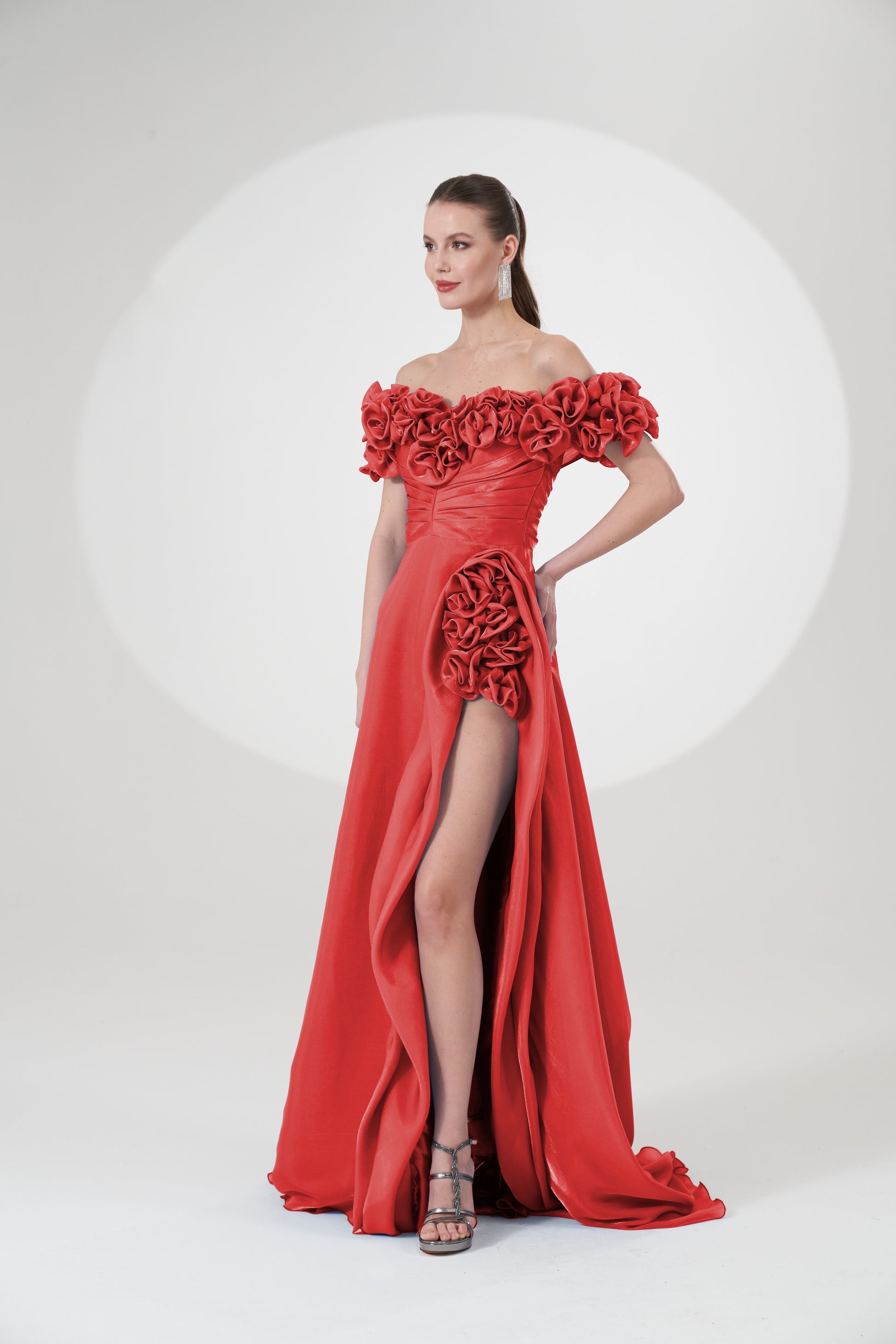 Step into the spotlight with our romantic WILLOW gown. This gown exudes elegance and sophistication, perfect for any formal event or special occasion. The off-the-shoulder neckline beautifully accentuates your collarbones, while the sleeveless design allows you to move with ease. The A-line silhouette with a high slit adds a touch of allure, while the rosette embellishments on the neckline and hip elevate the glamour of the gown.