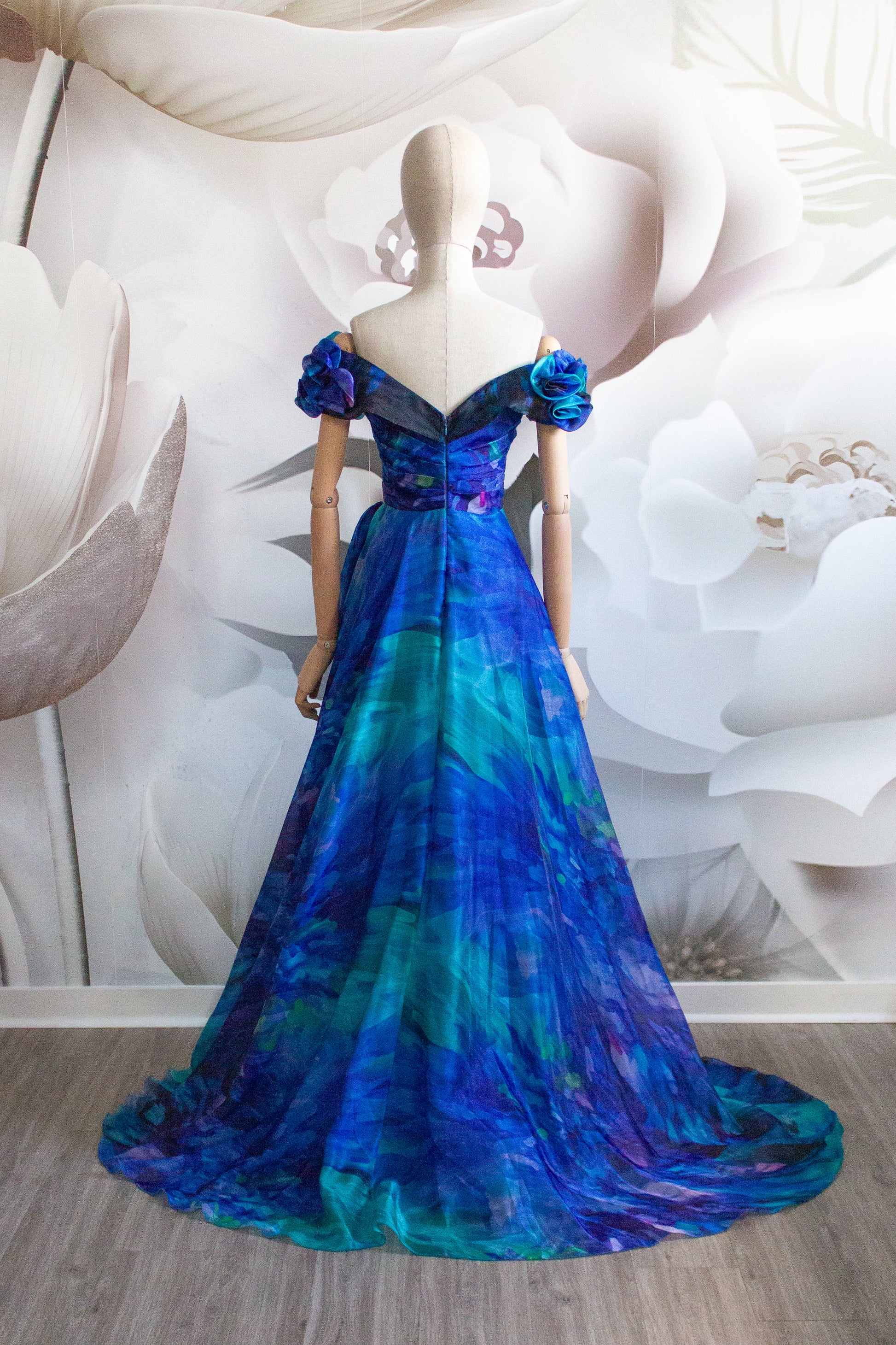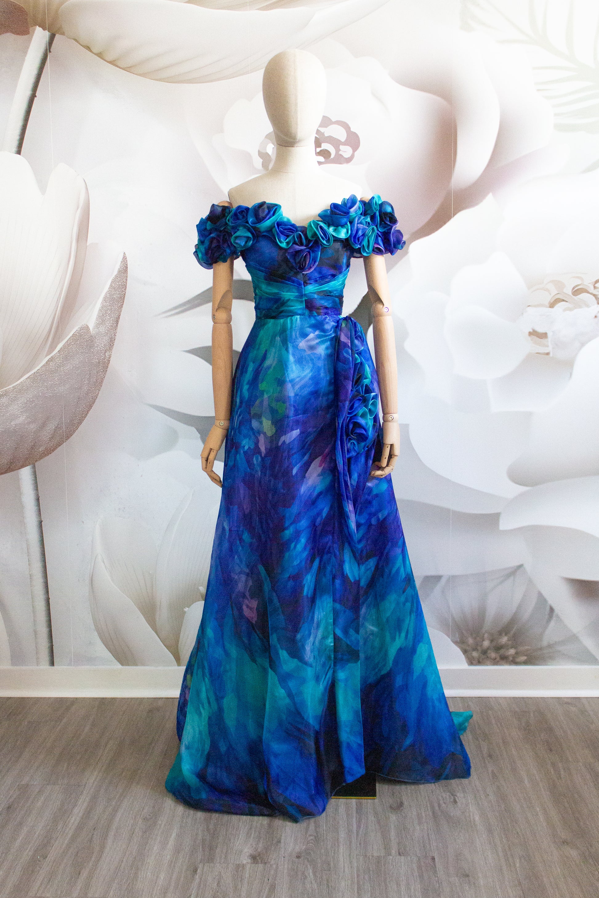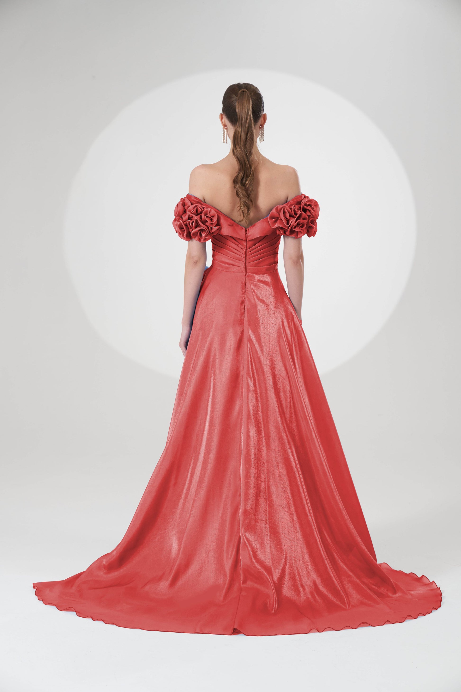 Step into the spotlight with our romantic WILLOW gown. This gown exudes elegance and sophistication, perfect for any formal event or special occasion. The off-the-shoulder neckline beautifully accentuates your collarbones, while the sleeveless design allows you to move with ease. The A-line silhouette with a high slit adds a touch of allure, while the rosette embellishments on the neckline and hip elevate the glamour of the gown.